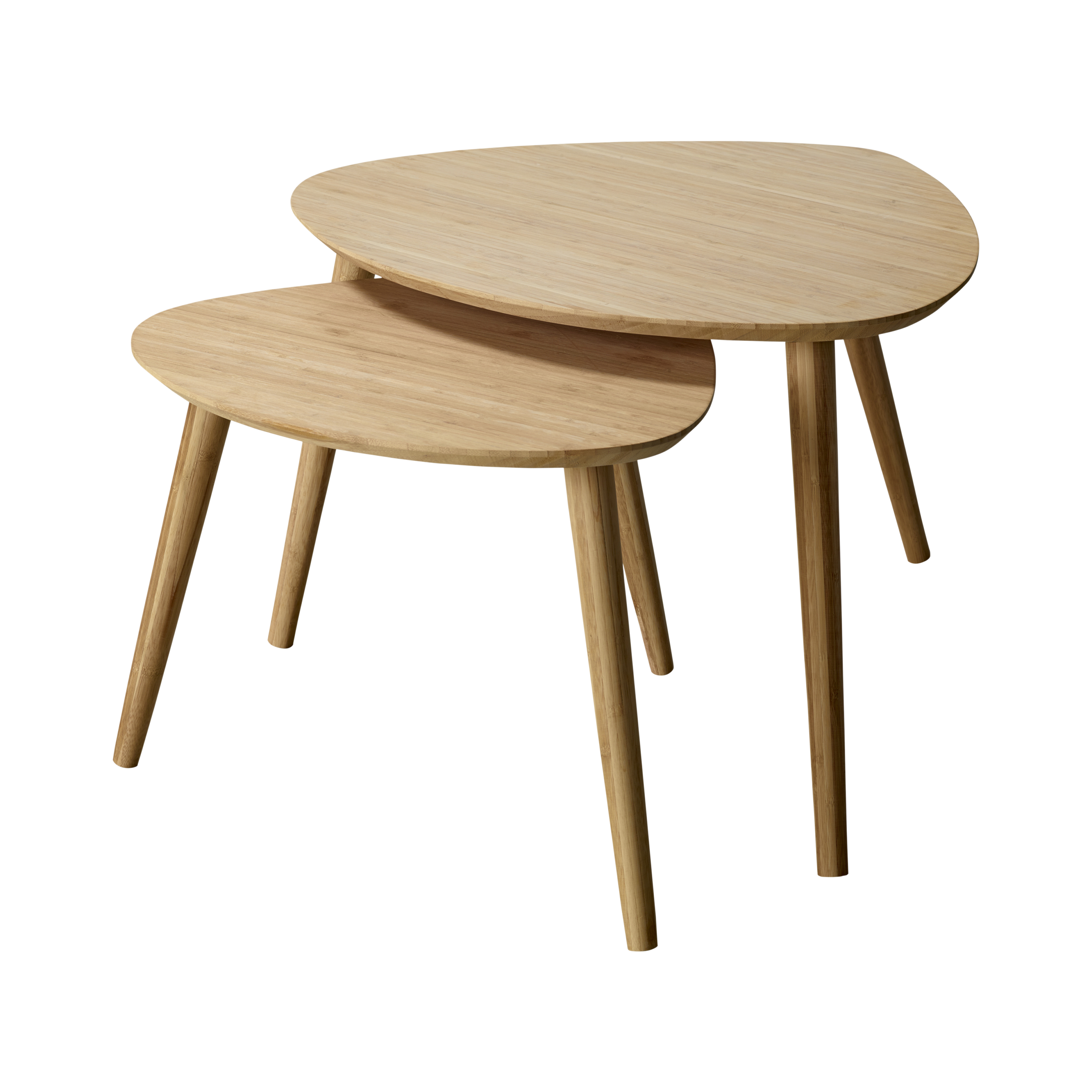 Två satsbord i olika höjder med ett enkelt, organiskt formspråk – flexibla i användning och tillverkade i bambu som ger ett varmt och naturligt uttryck.