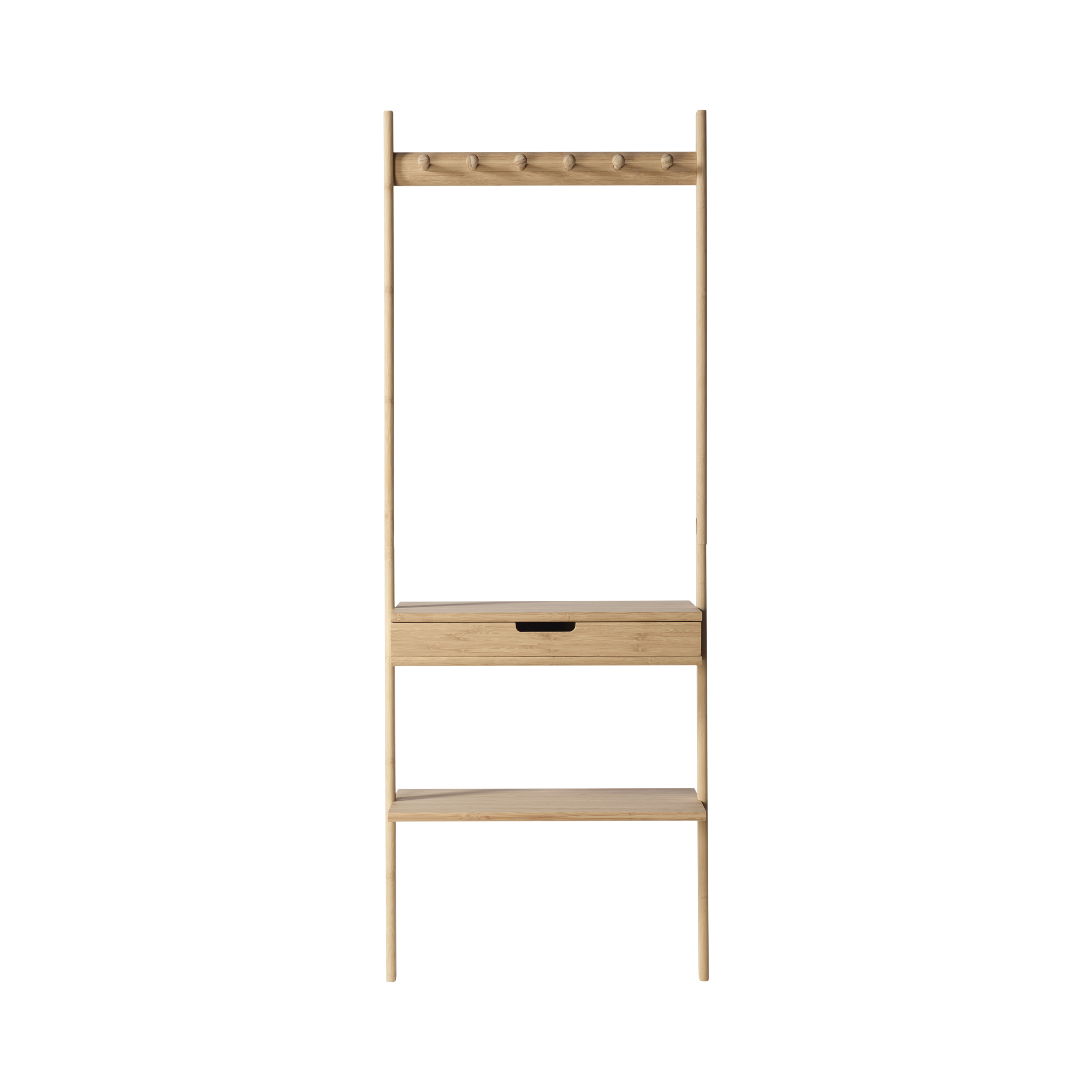 Ett lätt och varmt hallmöbel i obehandlad bambu, skapat för mindre hem och urbana miljöer. De öppna hyllorna samlar vardagens småsaker och ger hallen en naturlig och välkomnande känsla.