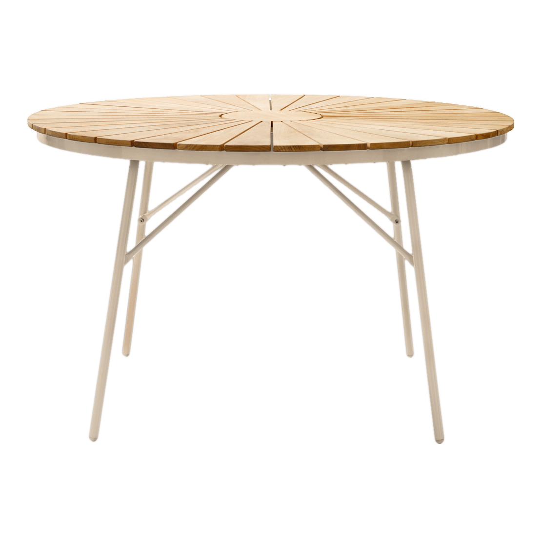Ellen bordet är seriens naturliga mittpunkt – ett runt bord med lätt och klassiskt uttryck som passar lika bra på terrassen, i sommarhuset eller i trädgården.