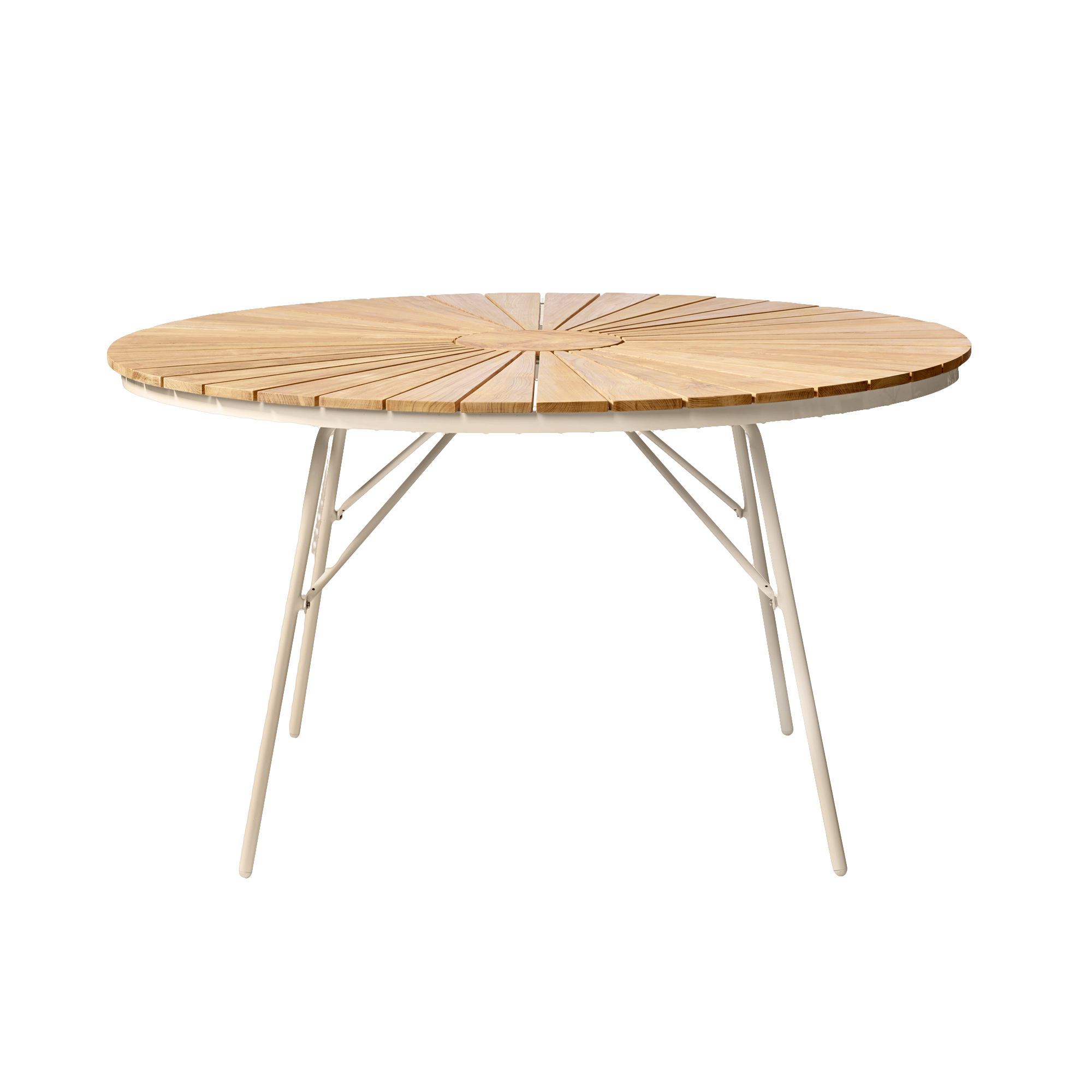 Ellen bordet är seriens naturliga mittpunkt – ett runt bord med lätt och klassiskt uttryck som passar lika bra på terrassen, i sommarhuset eller i trädgården.