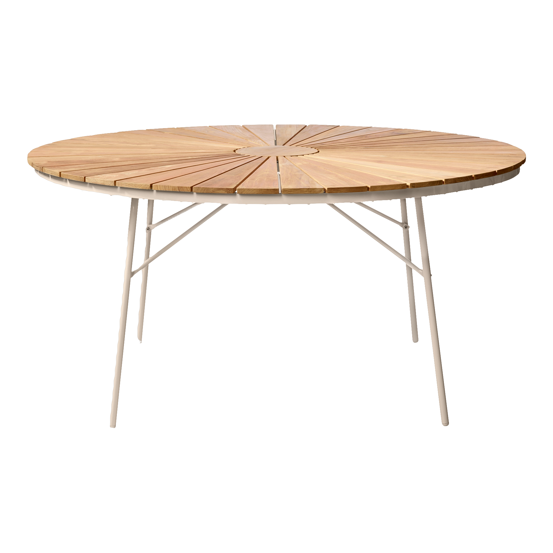 Ellen bordet är seriens naturliga mittpunkt – ett runt bord med lätt och klassiskt uttryck som passar lika bra på terrassen, i sommarhuset eller i trädgården.