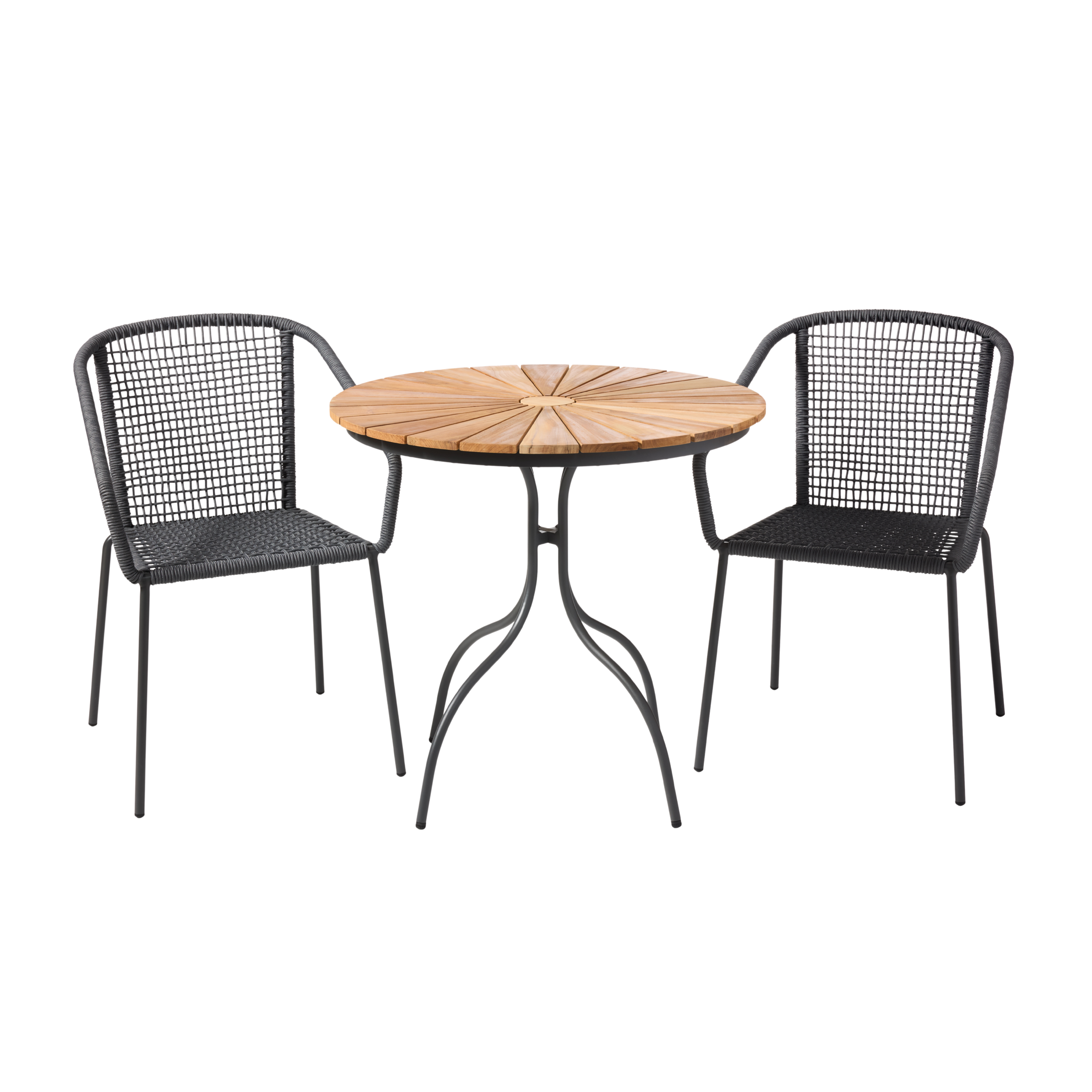 Det runda Ellen cafébordet med teaklameller tillför värme och ett klassiskt uttryck, medan det antracitgrå stativet ger en lugn och modern kontrast.
