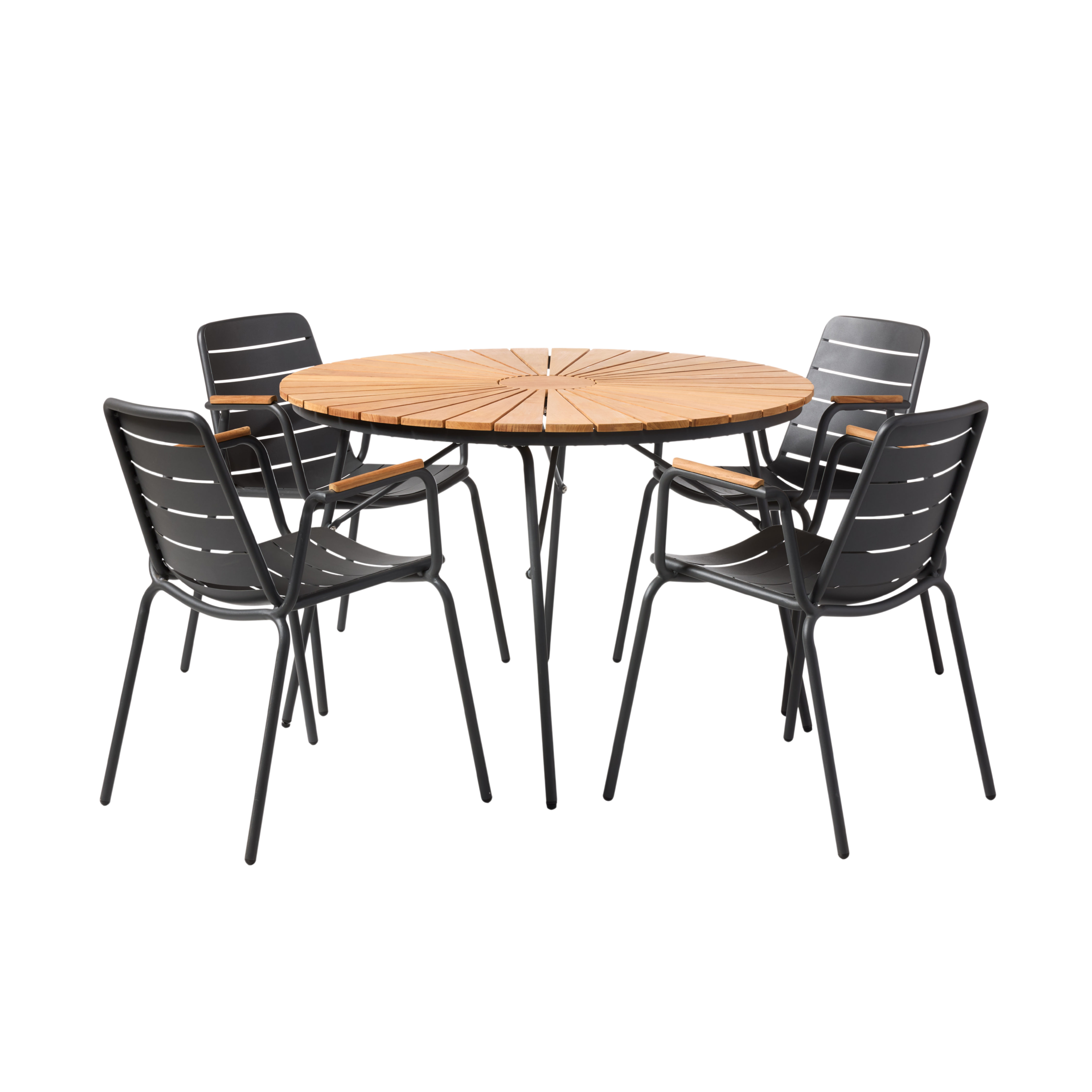 Parc stolarna ger helheten ett lätt och grafiskt formspråk. Det slanka, pulverlackerade aluminiumet och de horisontella linjerna i sits och rygg ger ett funktionellt och stramt uttryck, medan armstödens teakdetaljer knyter stolen naturligt till bordets träyta.