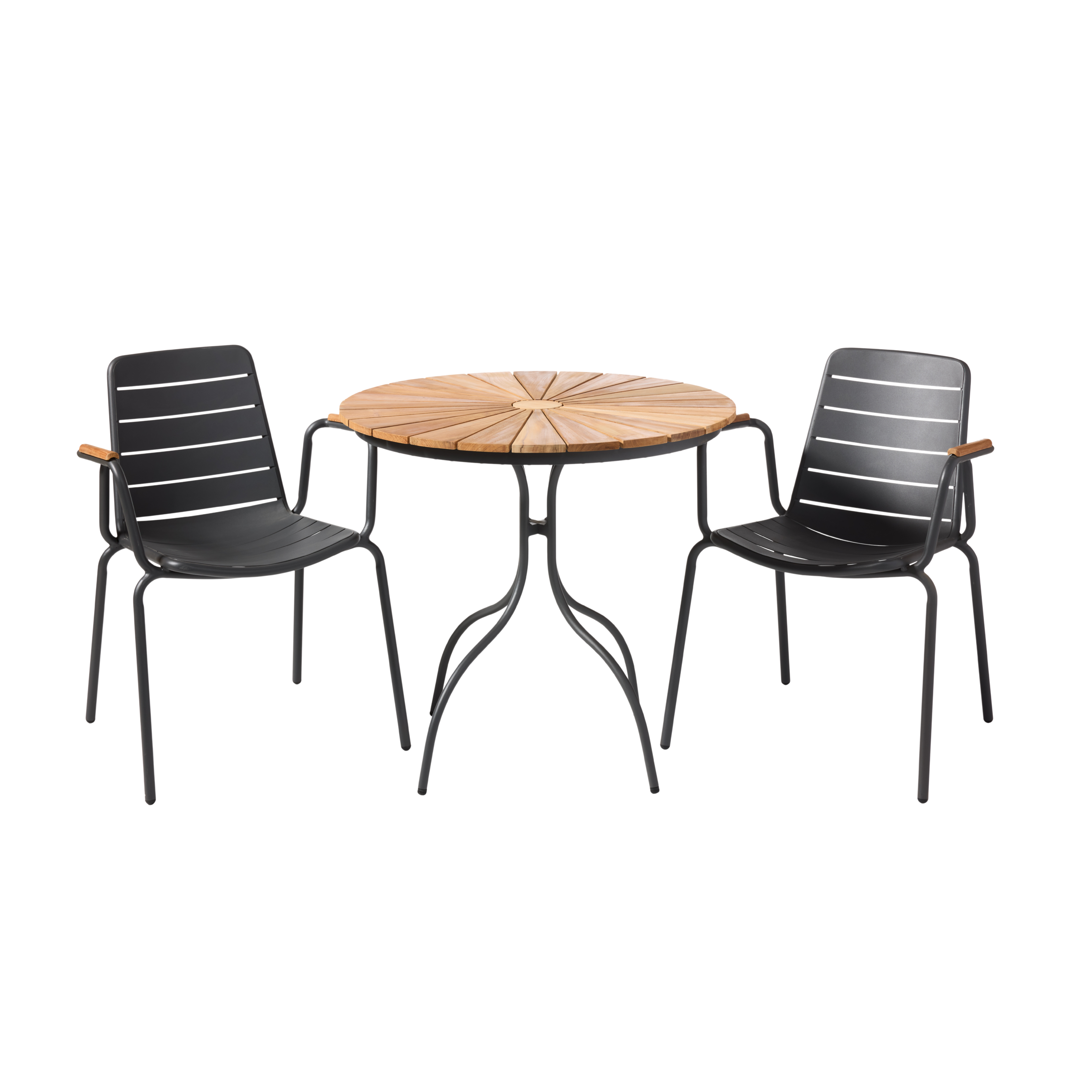 Det runda Ellen cafébordet med teaklameller tillför naturlig värme och ett tidlöst uttryck, medan det antracitgrå aluminiumstativet ger en lugn och modern kontrast.