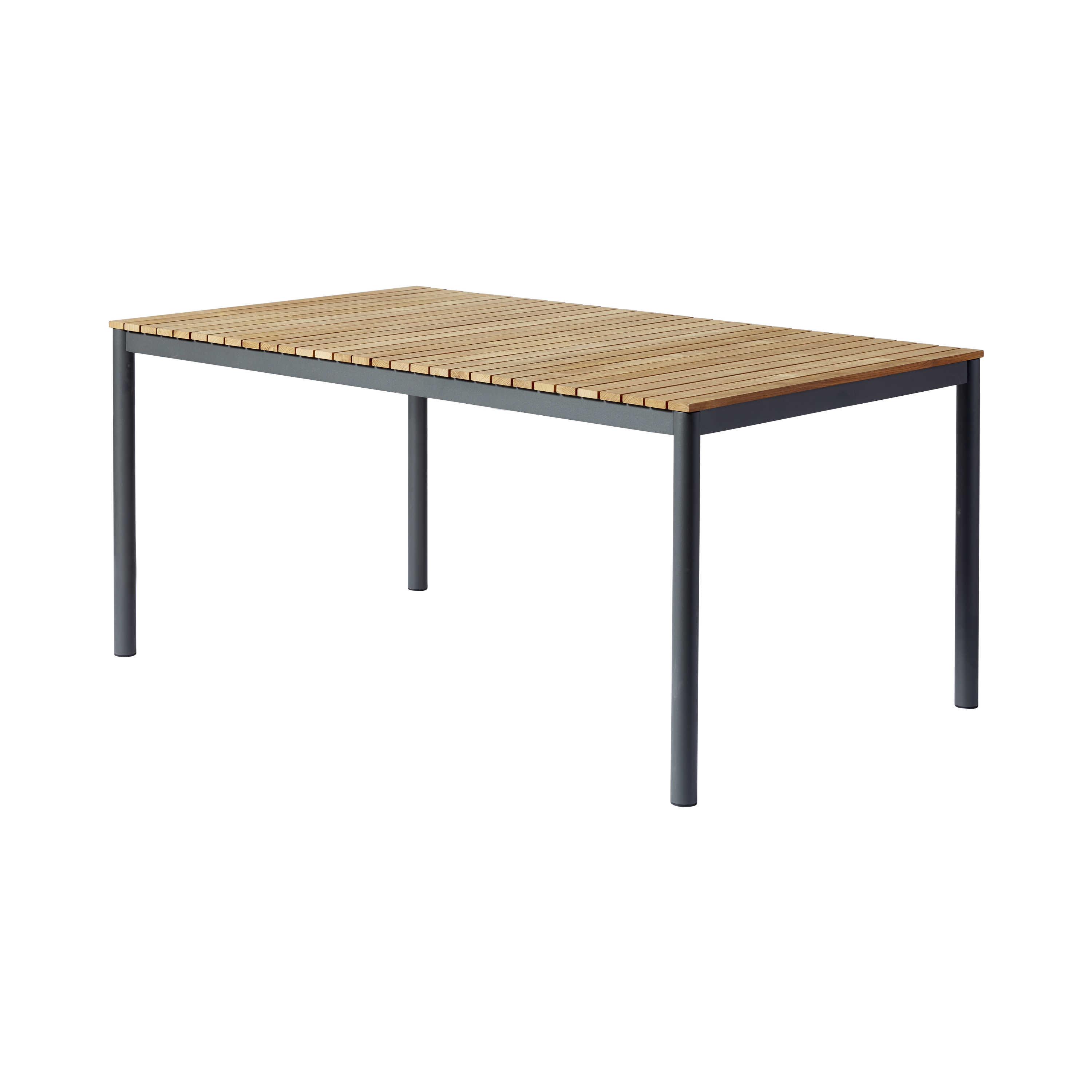 Bordsskivan är tillverkad i teak, vilket tillför värme, karaktär och ett naturligt uttryck, medan det pulverlackerade aluminiumstativet i antracit ger stabilitet och en lätt, modern kontrast. Kombinationen av material gör bordet robust, vädertåligt och lätt att integrera i många typer av utemiljöer.