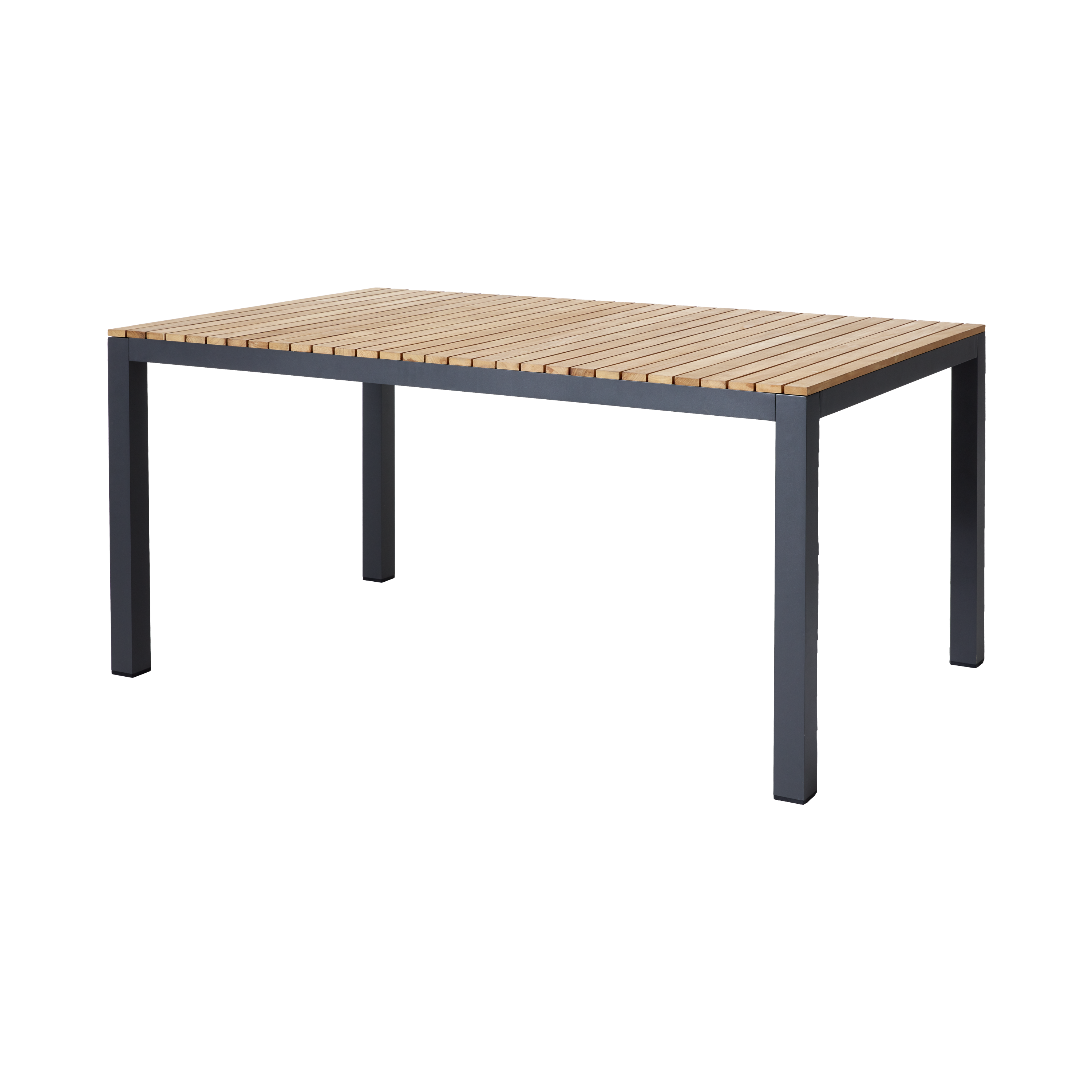 Ett modernt och karaktärsstarkt matbord i antracitgrå aluminium med bordsskiva i teak — skapat för livet utomhus och med flexibel plats för både vardag och gäster. Bordet är idealiskt för fyra personer, men rymmer enkelt upp till sex.