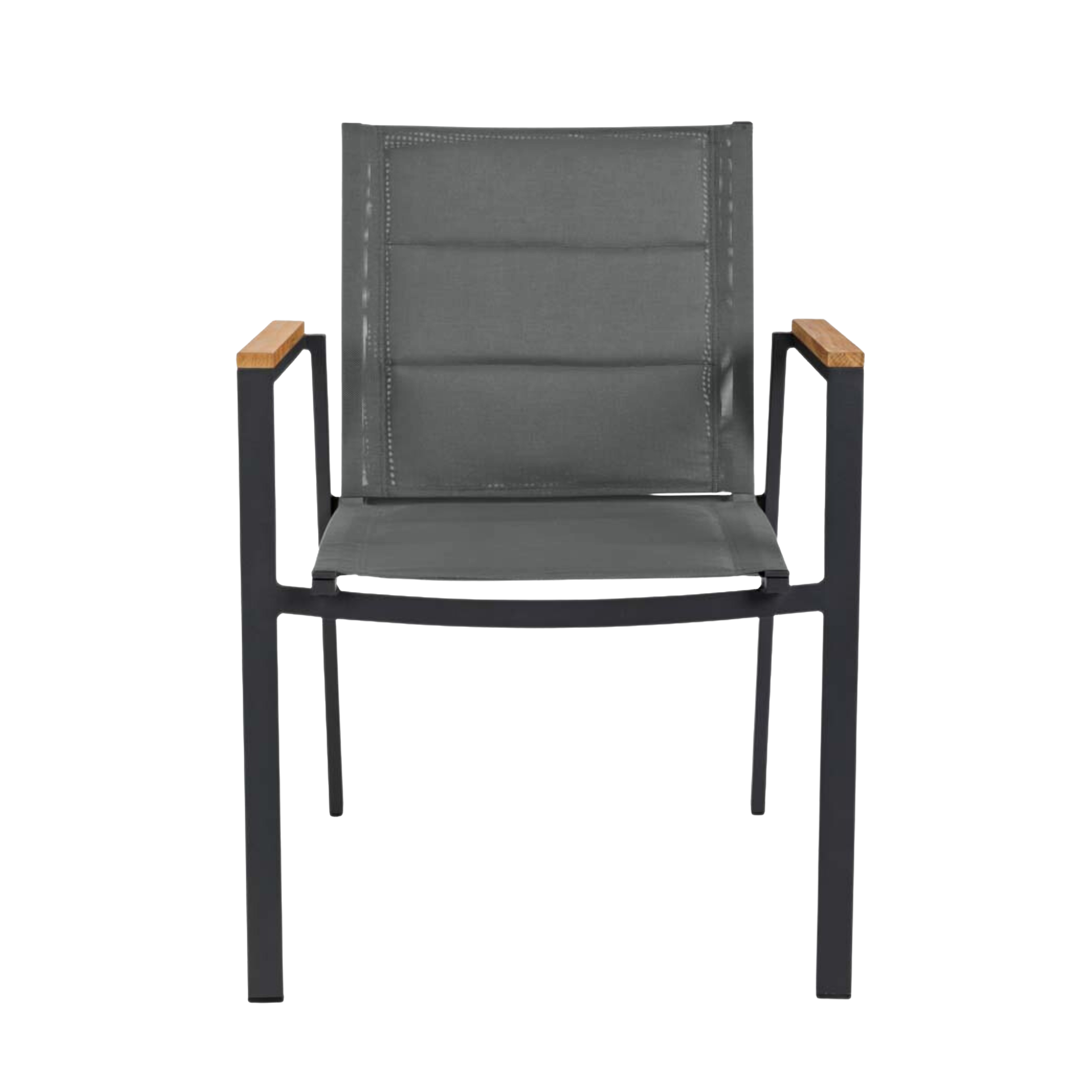 Det antracitgrå aluminiumstativet kombinerat med armstöd i teak och den dubbelsidigt vävda mesh-väven ger stolen ett elegant, luftigt och raffinerat uttryck — perfekt för terrasser, innergårdar och modern arkitektur.