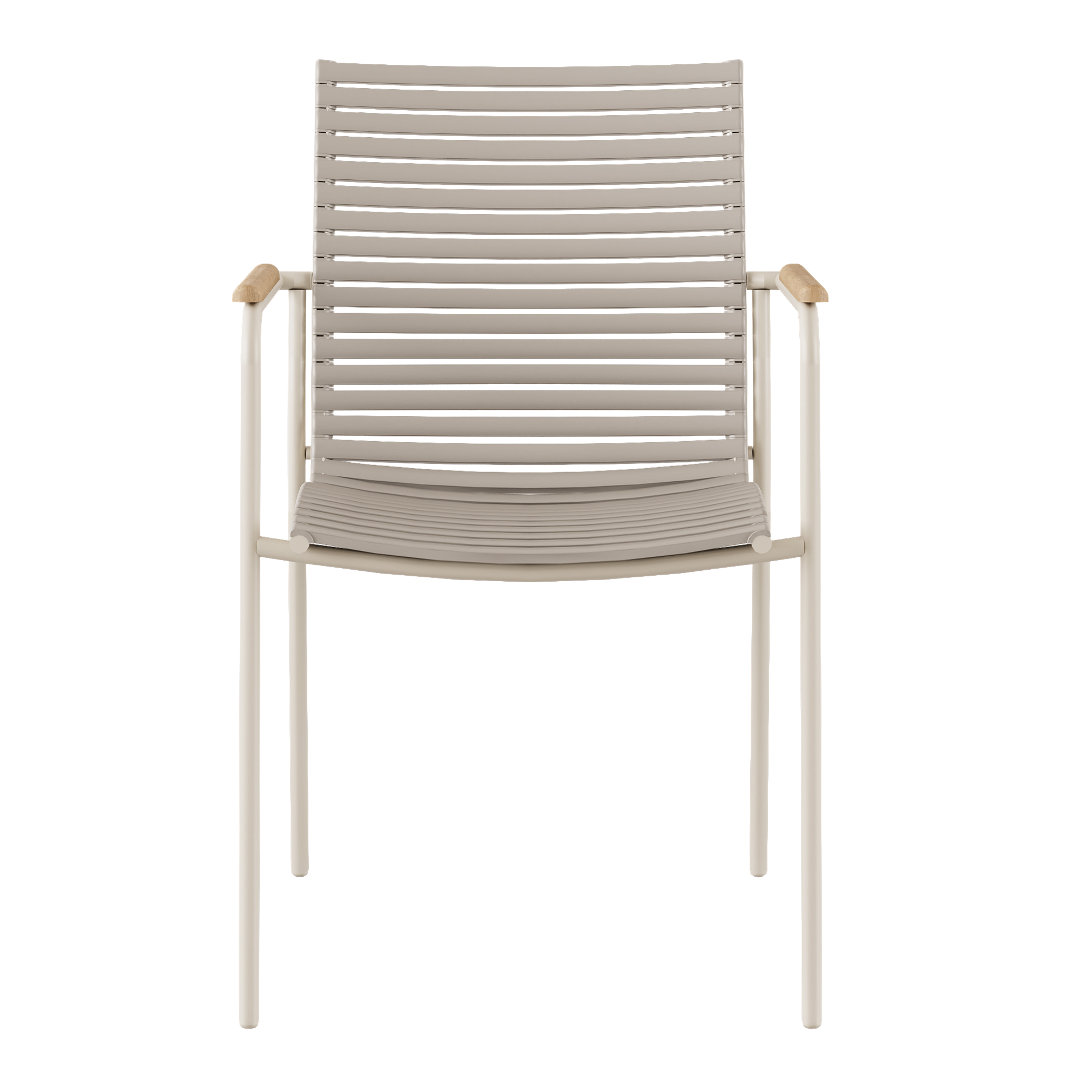 En elegant och lätt stol i sandfärgad aluminium med armstöd i teak och smala, väderbeständiga lameller — skapad för utemiljöer med ett ljust, stilla och modernt uttryck.