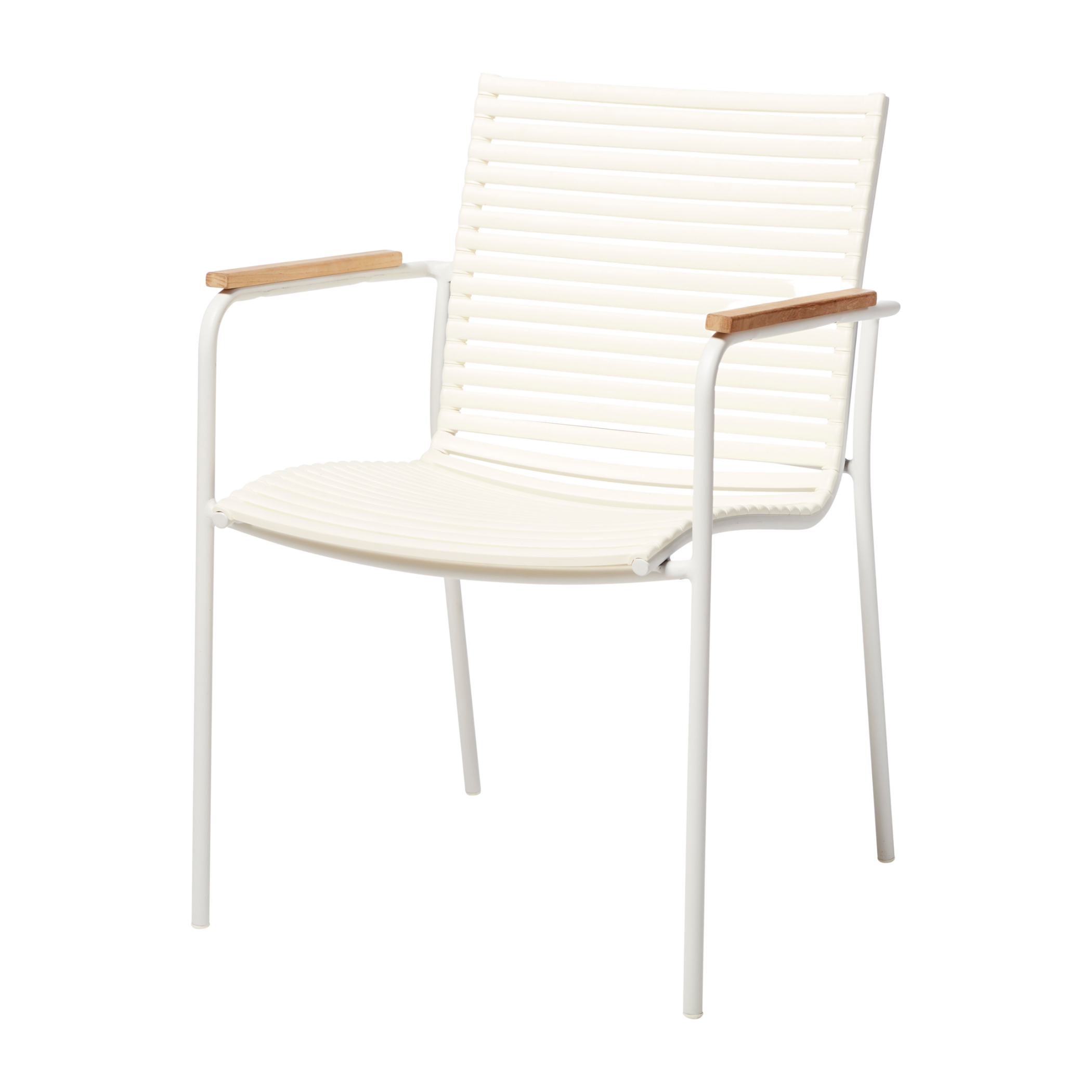 En elegant och lätt stol i vitlackerad aluminium med armstöd i teak och smala, väderbeständiga lameller — med möjlighet att byta lamellerna och anpassa stolens uttryck efter stil och säsong.