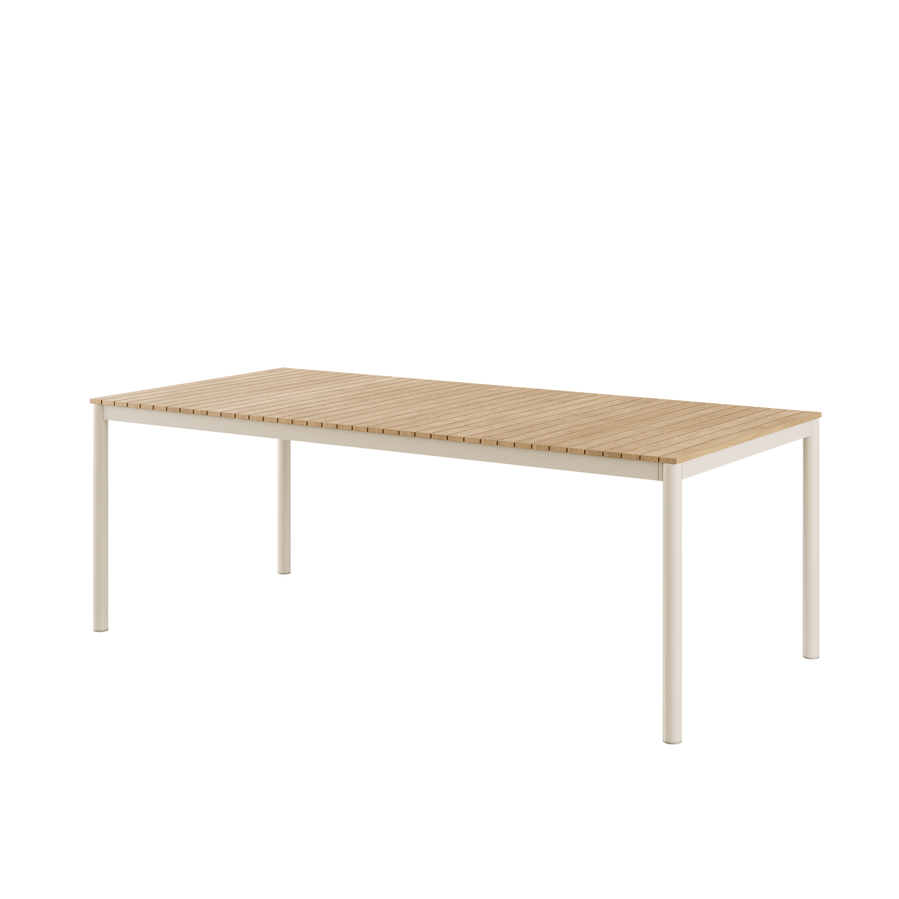 Ett elegant och stilrent matbord i sandfärgad aluminium med bordsskiva i teak – skapat för utemiljöer där nordiskt lugn, rena linjer och ett tidlöst formspråk står i fokus. Bordet rymmer bekvämt sex personer och kan enkelt ta upp till åtta.