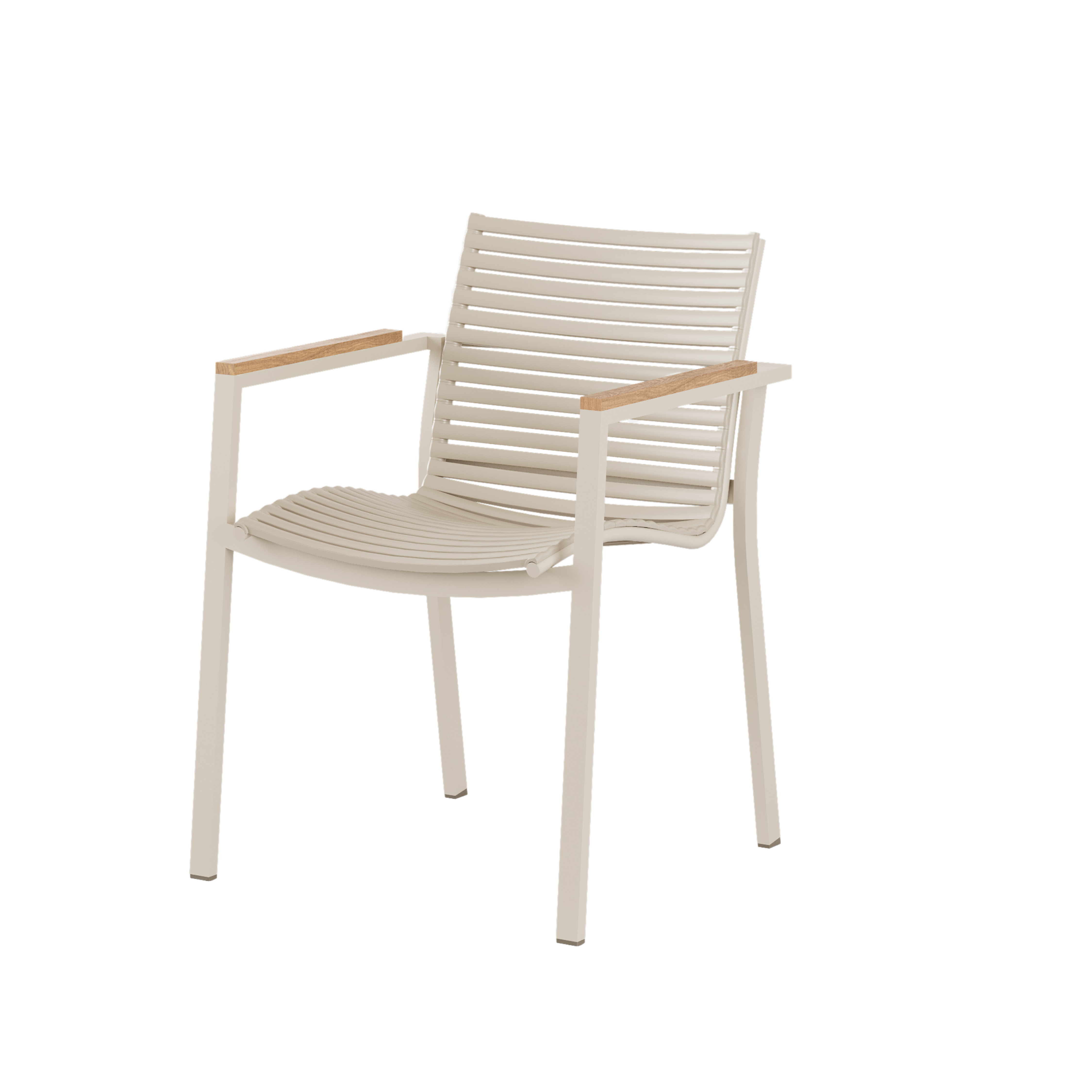 Det sandfärgade aluminiumstativet kombinerat med armstöd i teak och väderbeständiga PP-lameller ger stolen ett ljust, lugnt och nutida uttryck.