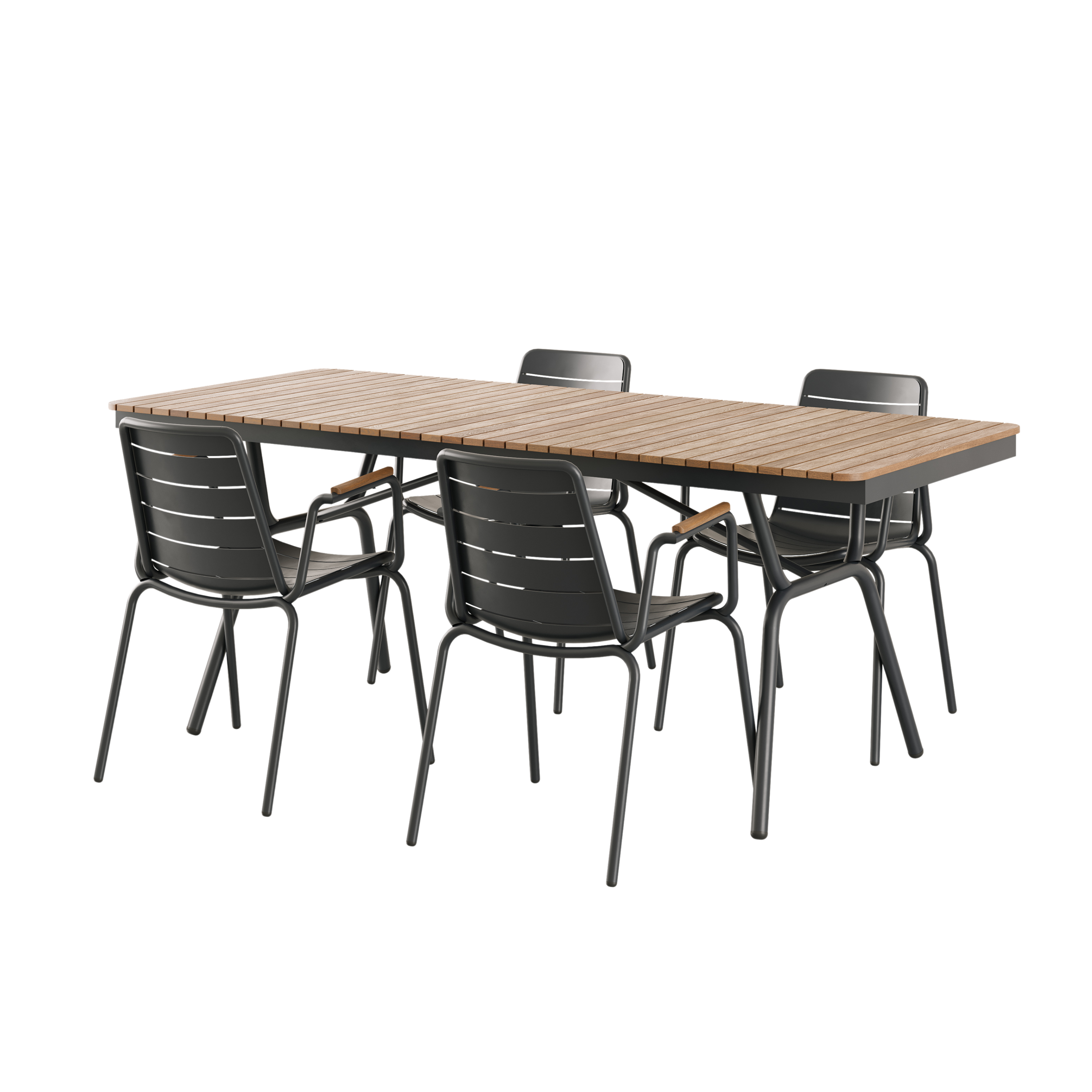 Setet är tillverkat med teaklameller i kombination med ett antracitfärgat, pulverlackerat stativ, vilket ger ett modernt och balanserat uttryck. De rena linjerna och den mörka färgen skapar en tydlig kontrast till träets värme och gör setet lätt att integrera i många olika typer av utemiljöer.
