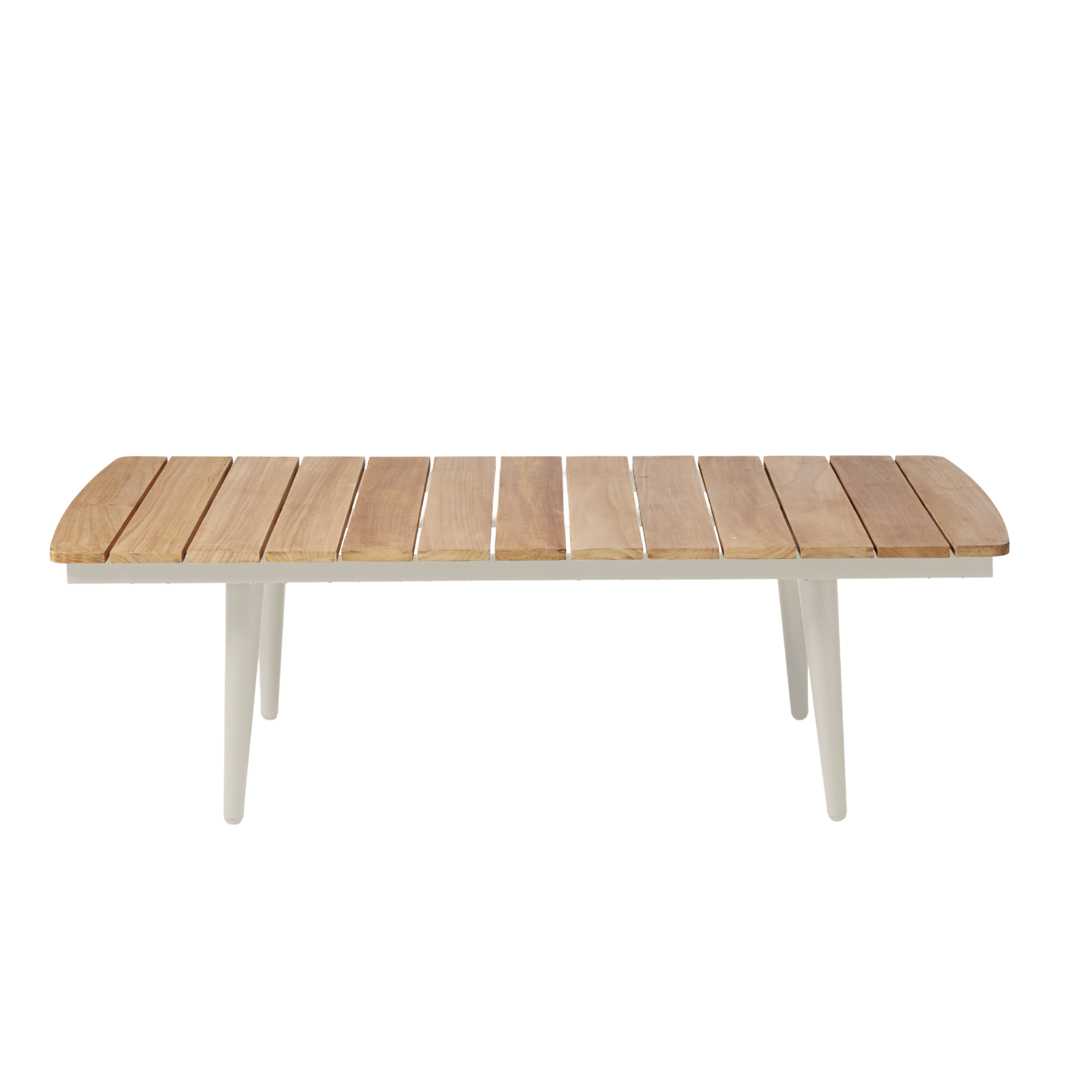 Ett stilrent och funktionellt bord som kombinerar sandfärgad aluminium för lätthet och hållbarhet med en bordsskiva av exklusiv teak.