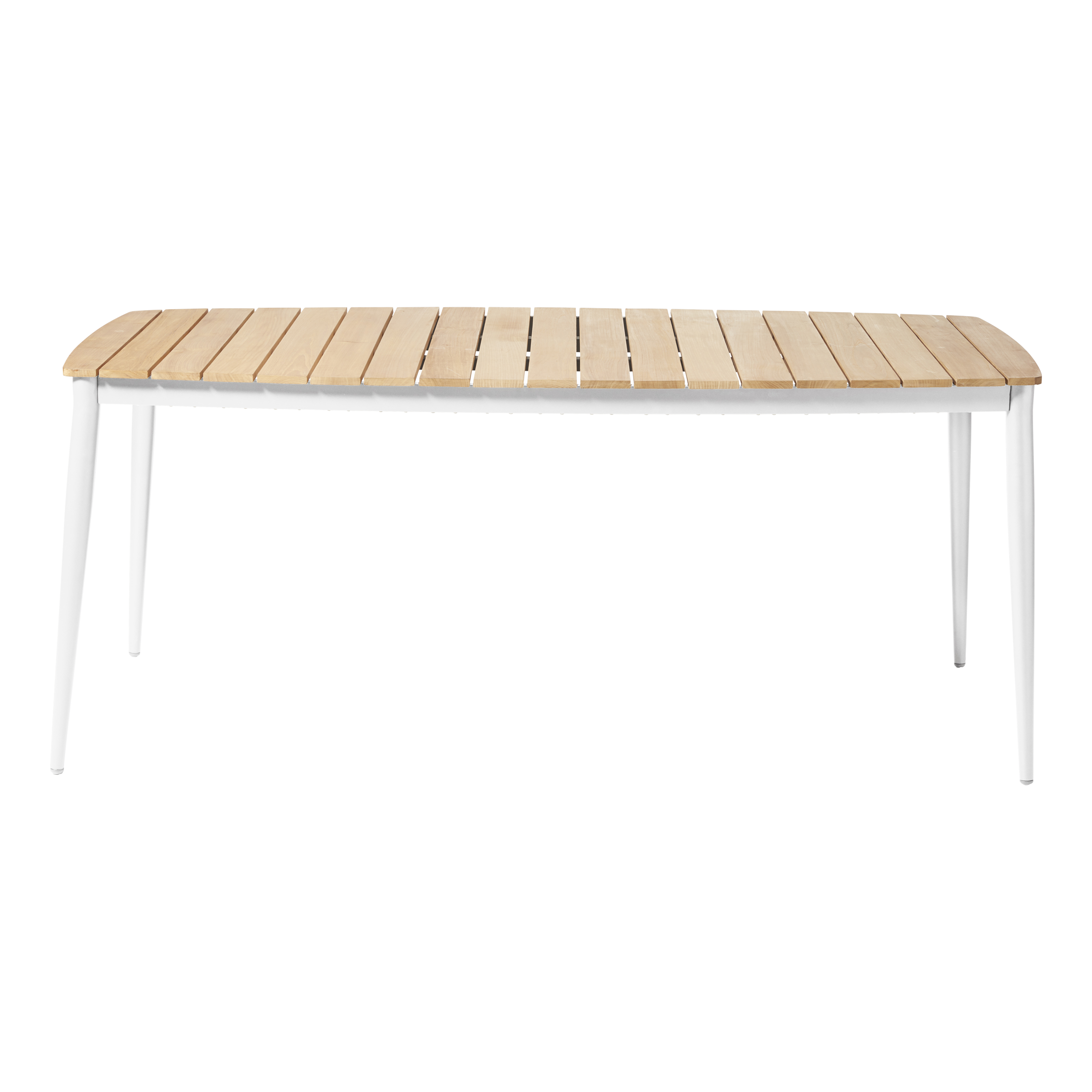 Ett elegant utomhusbord som kombinerar pulverlackerad aluminium i vitt med en bordsskiva av varma teaklameller.
