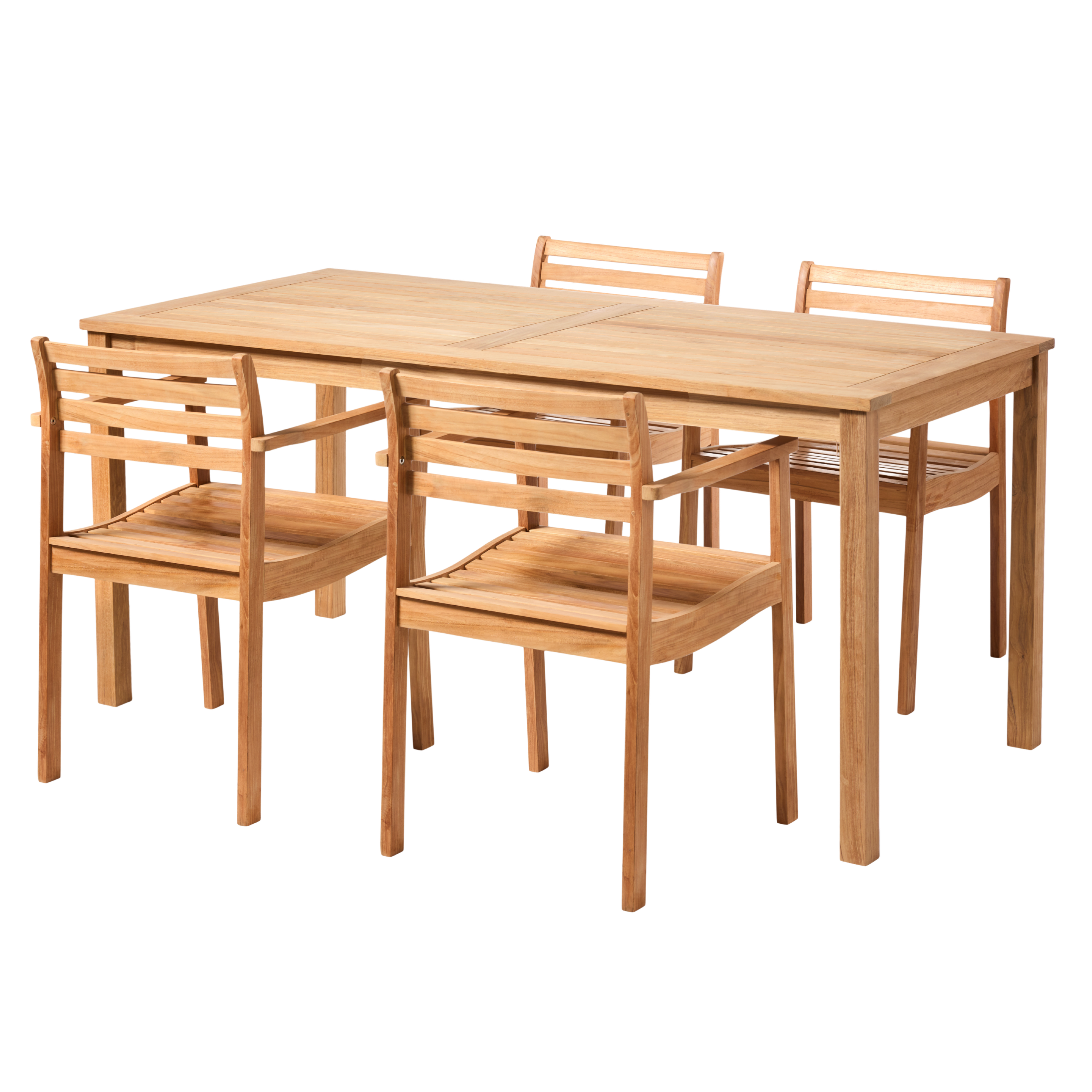 Ett klassiskt trädgårdsset i teak med ett lugnt och välbalanserat uttryck. Rosenholm-setet består av ett bord och fyra stolar – skapat för uteliv där estetik, komfort och vardagsanvändning går hand i hand.