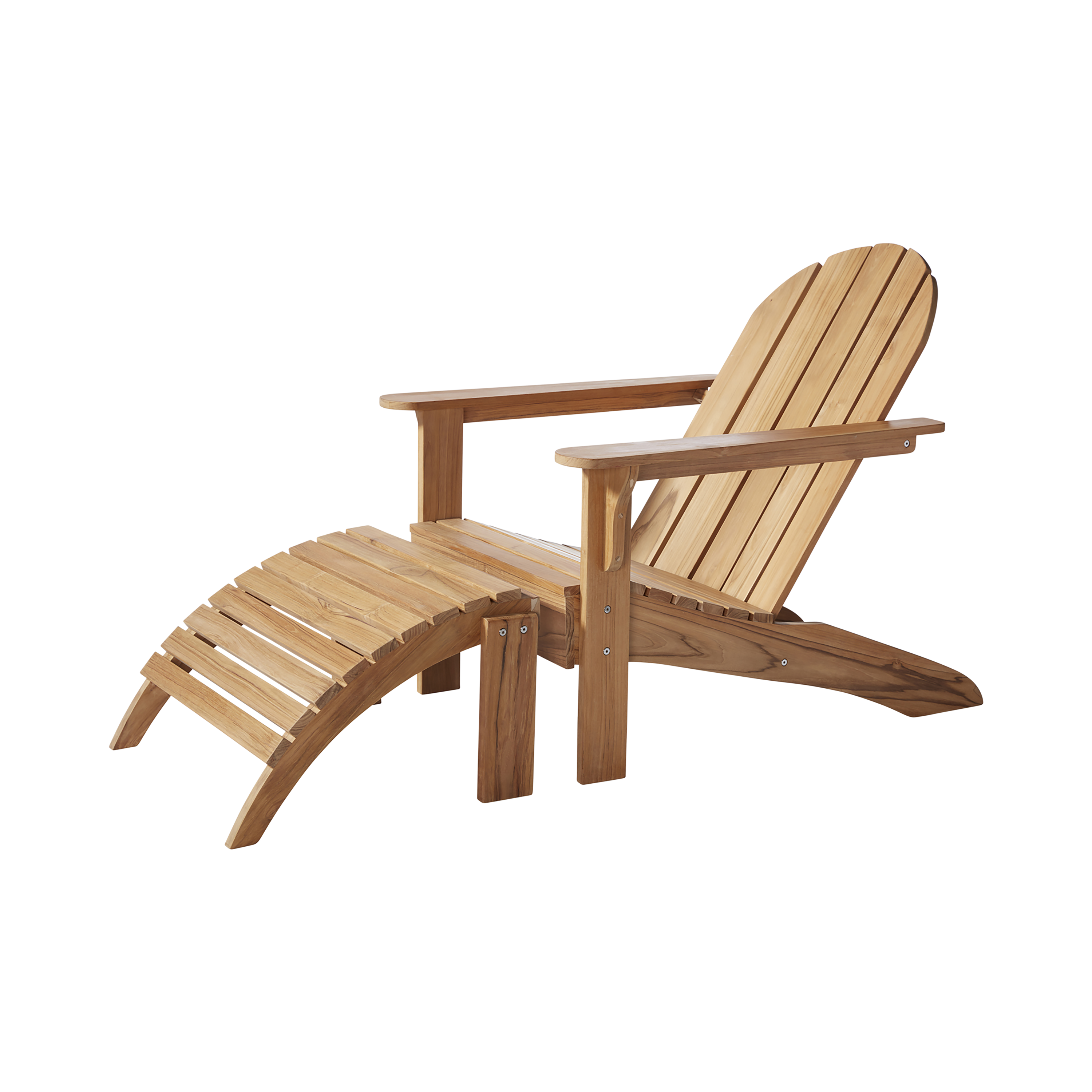 Adirondack stolen och fotpallen bildar tillsammans en viloplats i teak – skapad för ro, komfort och kvalitet i det fria.