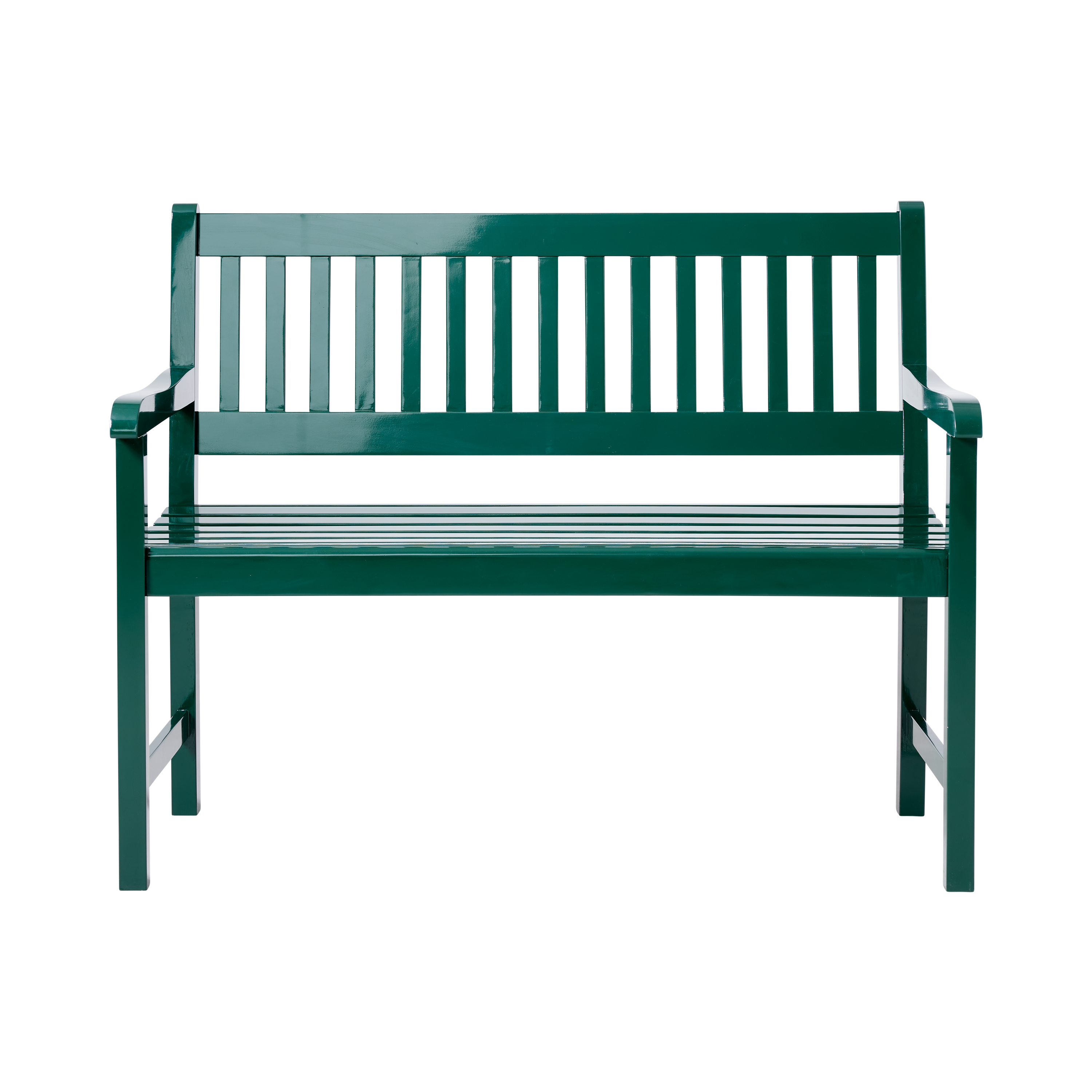 Bänken är tillverkad i mahogny – ett starkt och hållbart träslag – och målad i klassisk engelsk grön, vilket ger ett elegant men robust uttryck.