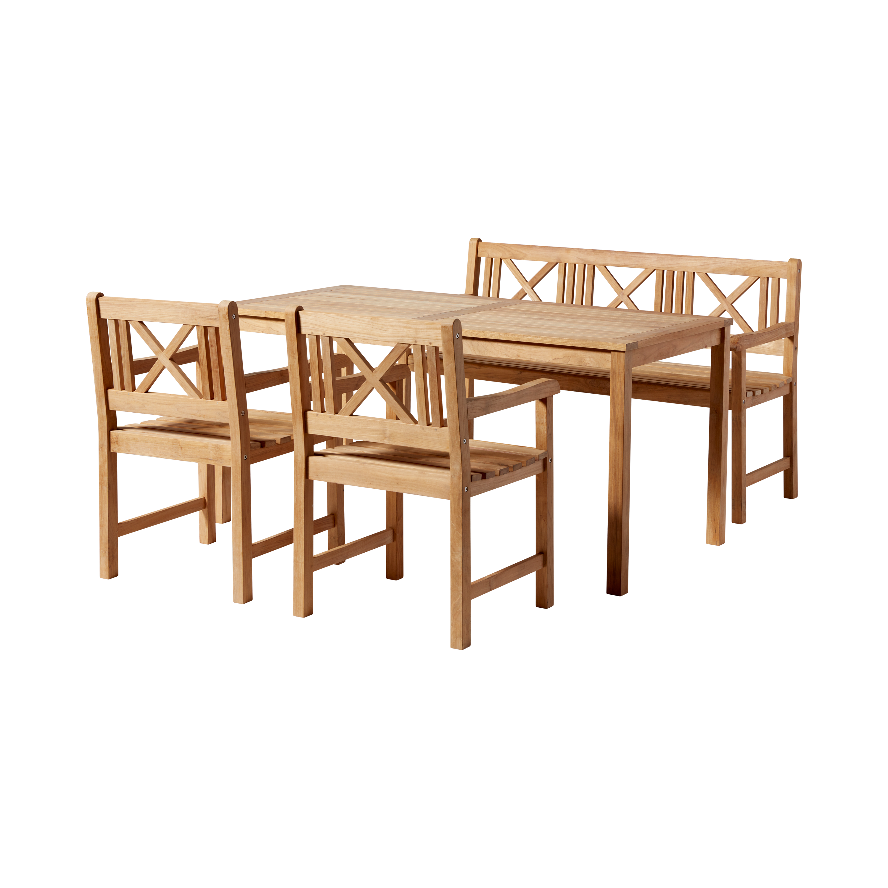 De rena linjerna, den karakteristiska krysskonstruktionen och den genomarbetade teakfinishen ger setet ett lugnt och harmoniskt uttryck som talar över tid och generationer. Här finns plats för måltider, långa samtal och stilla stunder där vardagen får ta plats.