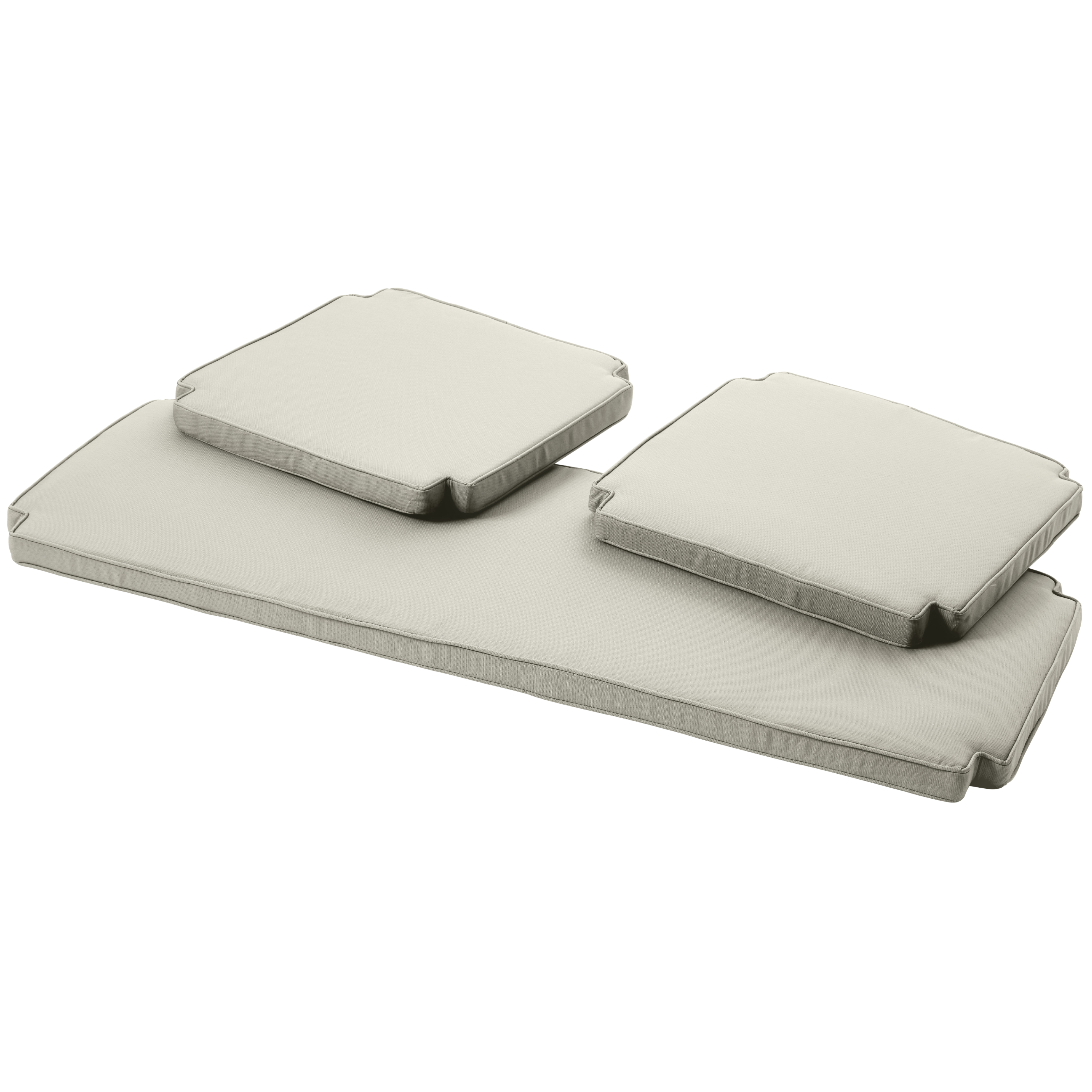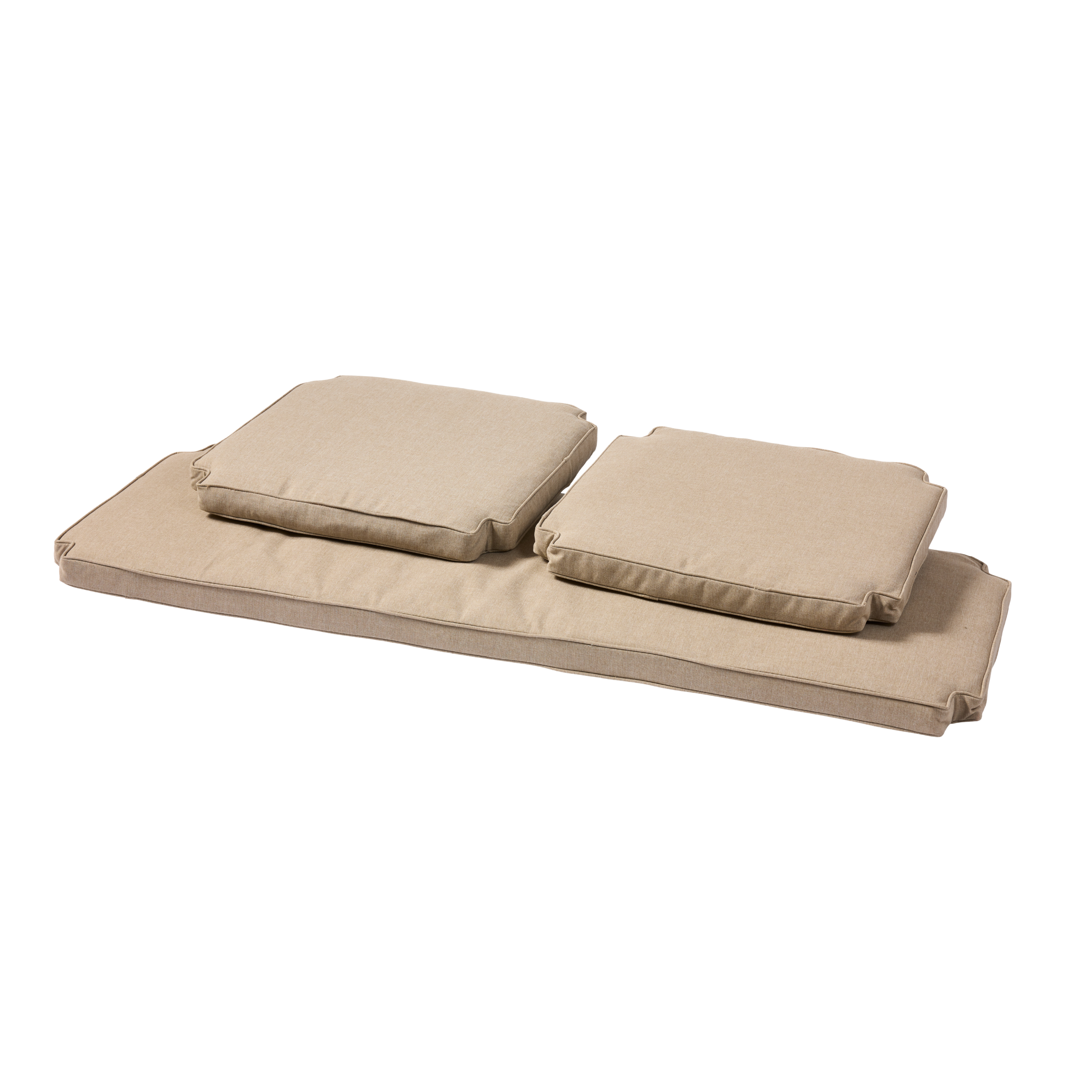 Setet består av tre delar: en dyna till tre-personers bänken och två dynor till stolarna. Dynorna är tillverkade i slitstarkt polyester med en mjuk polyfill-fyllning som ger en behaglig sittupplevelse säsong efter säsong.