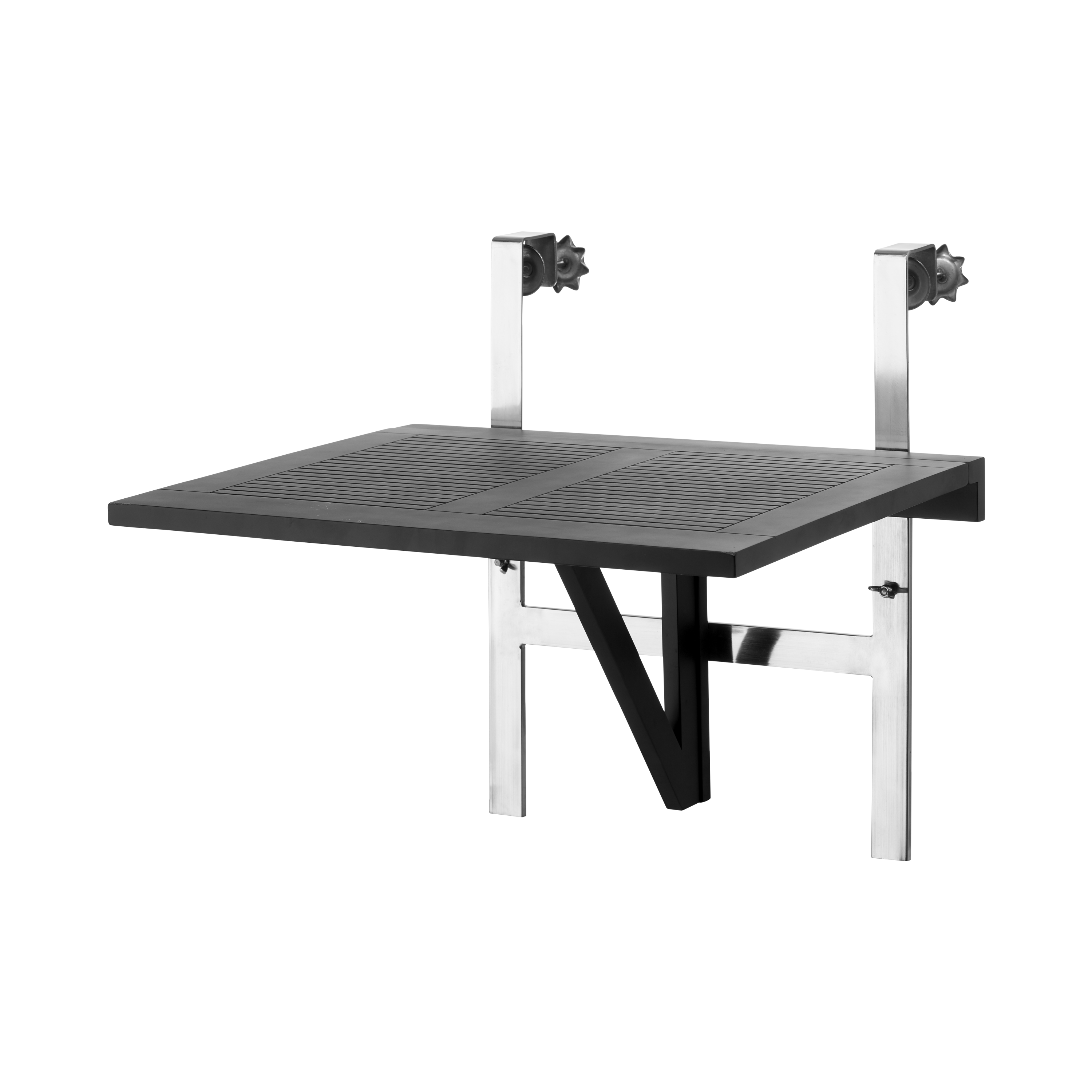 Ett platsbesparande balkongbord i svartmålad mahogny med justerbara beslag i rostfritt stål – skapat för stadsliv, små balkonger och uterum där varje centimeter räknas.
