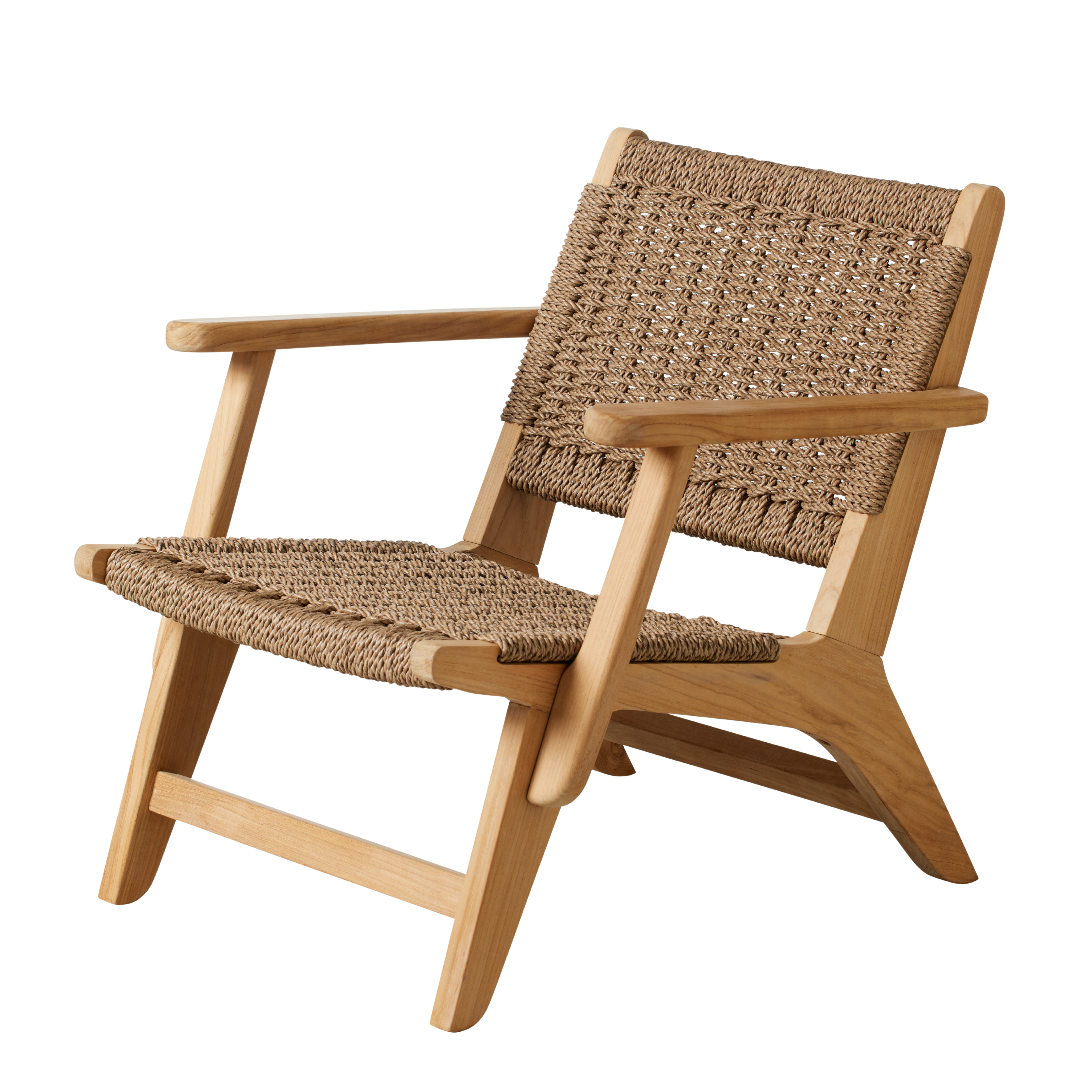En inbjudande utomhus-loungestol i teak och vädertåligt Viro-rep, skapad för att luta sig tillbaka och njuta av livet utomhus.