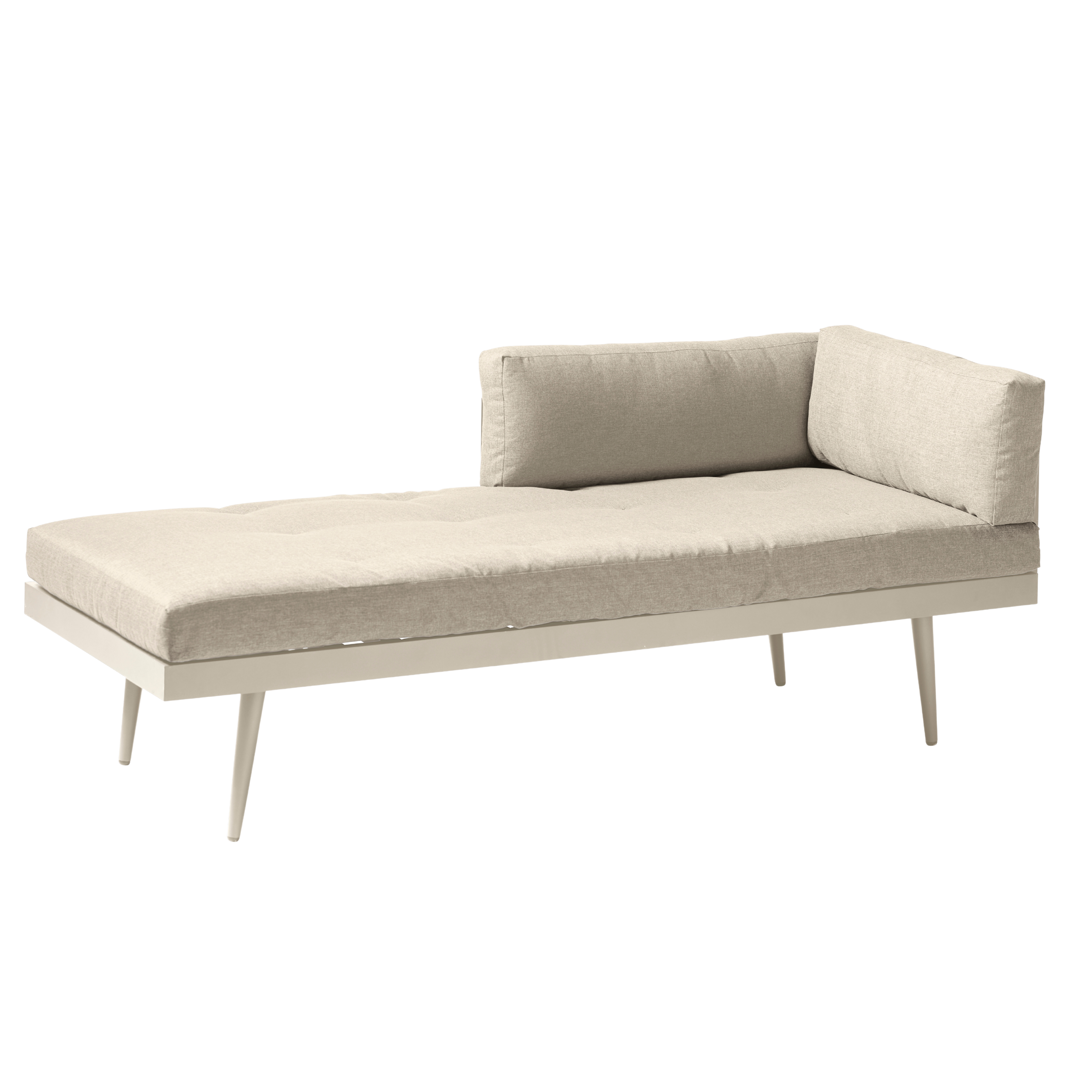 Daybeden finns i flera varianter – här med stomme i sandfärgad aluminium och dynor i sandfärgat polyester.