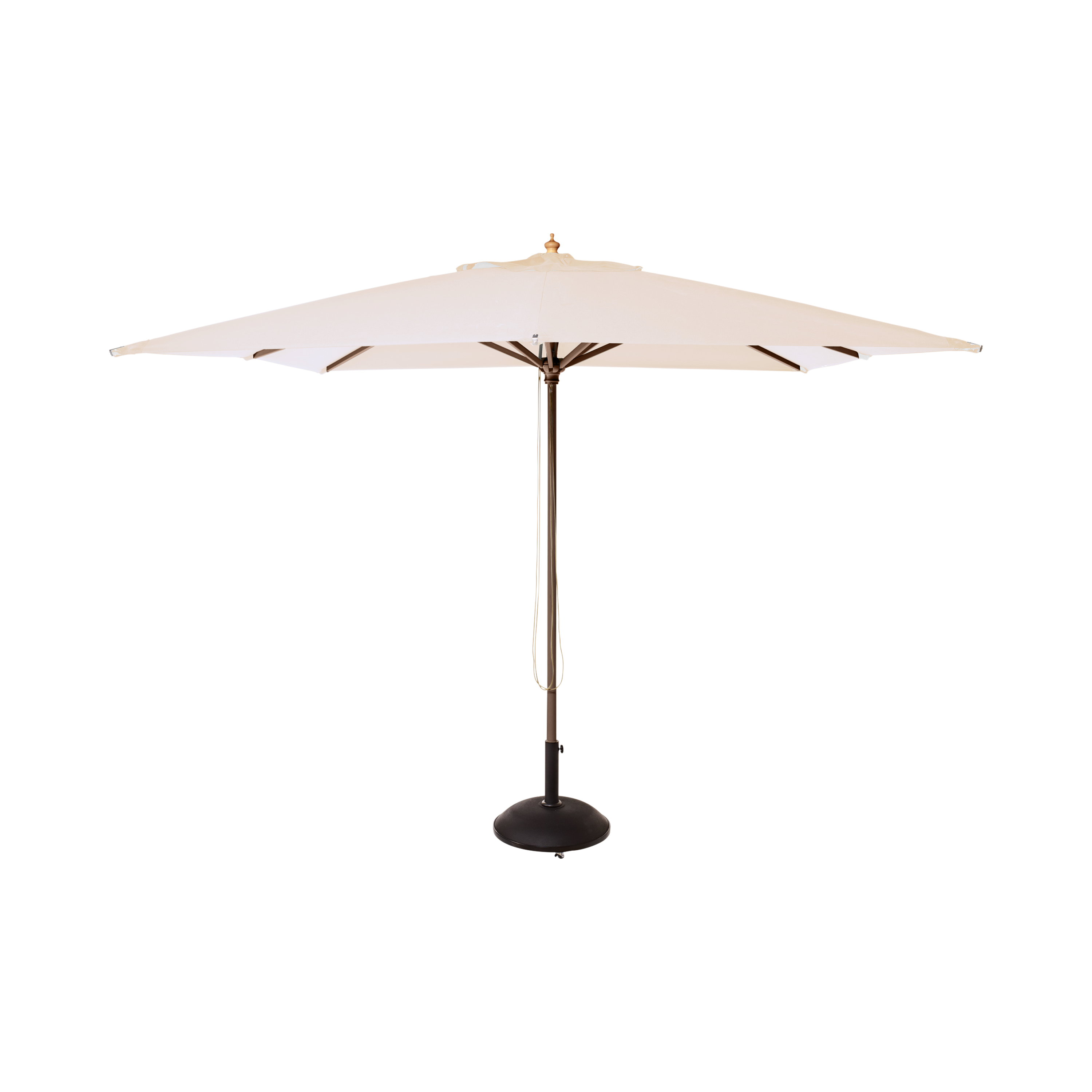 Duken är sydd i färgäkt olefin – ett starkt och hållbart material som behåller sin vackra färg över tid och ger ett behagligt solskydd. Den stabila mittstången i trä med teakfärgad finish tillför värme och naturlighet och är konstruerad för daglig användning utomhus.