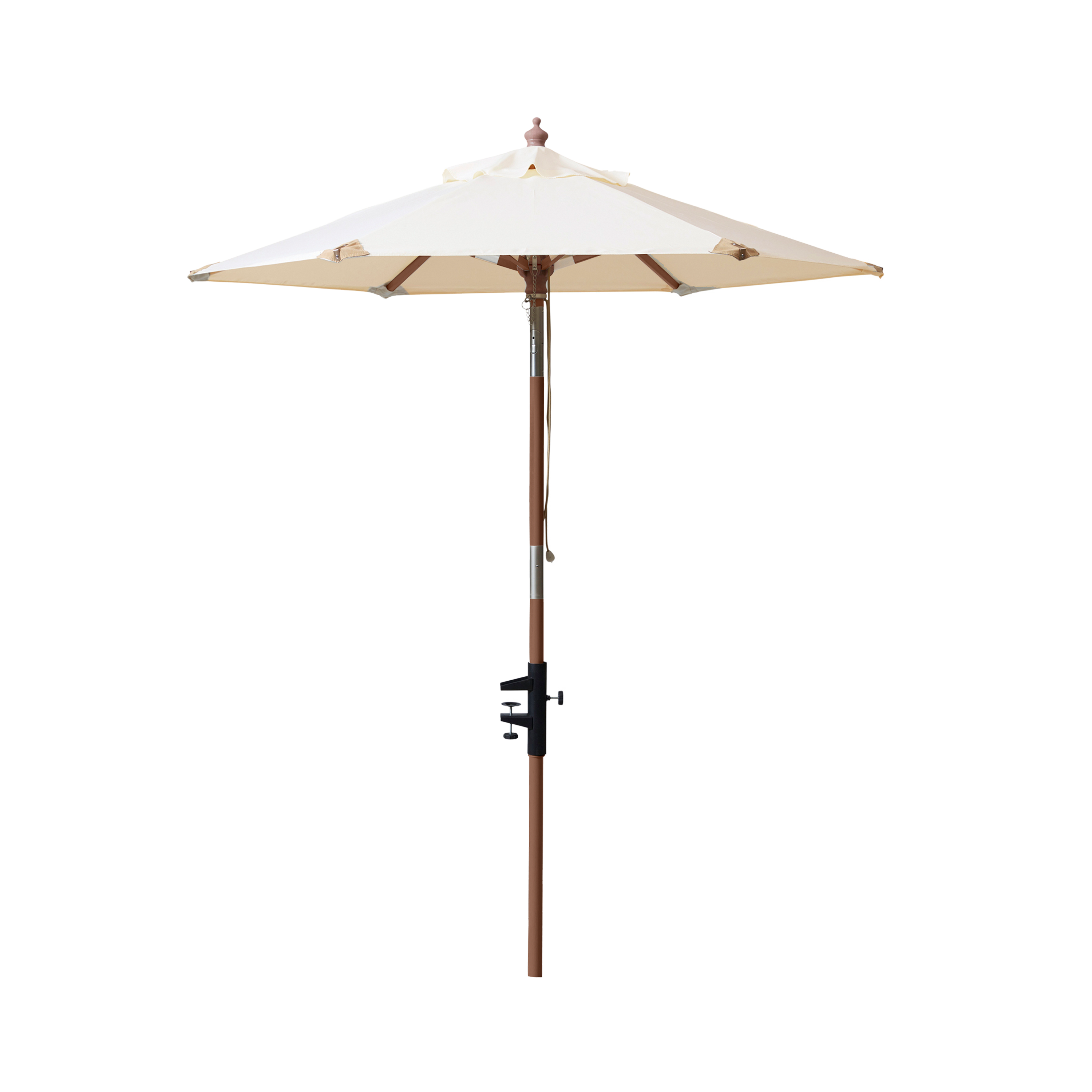 Balkongparasollen finns i tre varianter – här visas den med teakfärgad stång och off-white duk.
