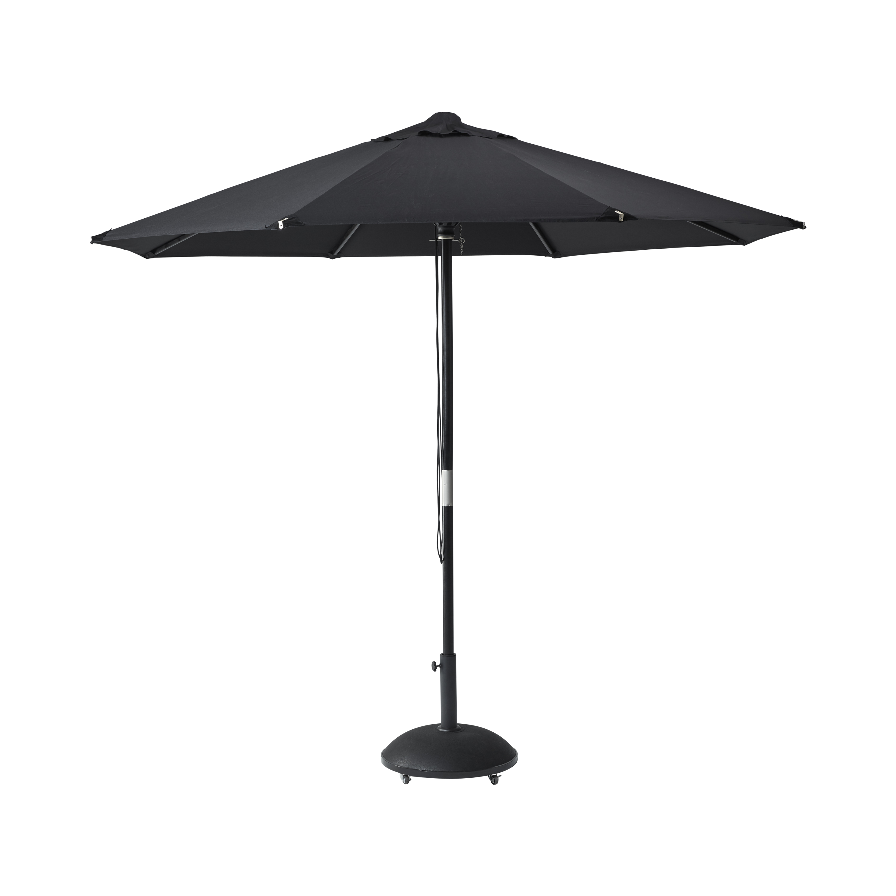 Ett runt parasoll i helsvart – både stång och duk – sytt i färgäkt polyester och med en diameter på 300 centimeter. Skapat för ett rent, enhetligt uttryck på terrassen, balkongen eller i innergården.
