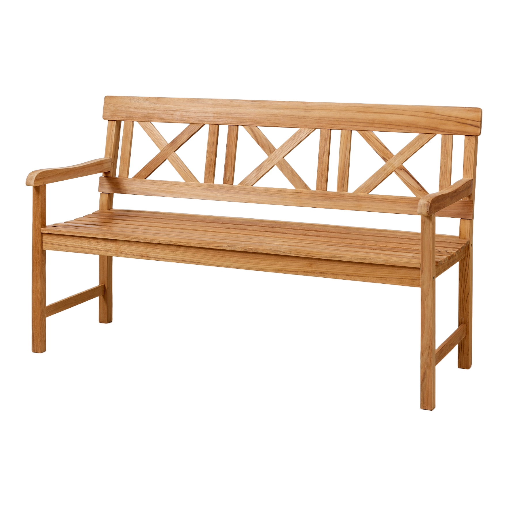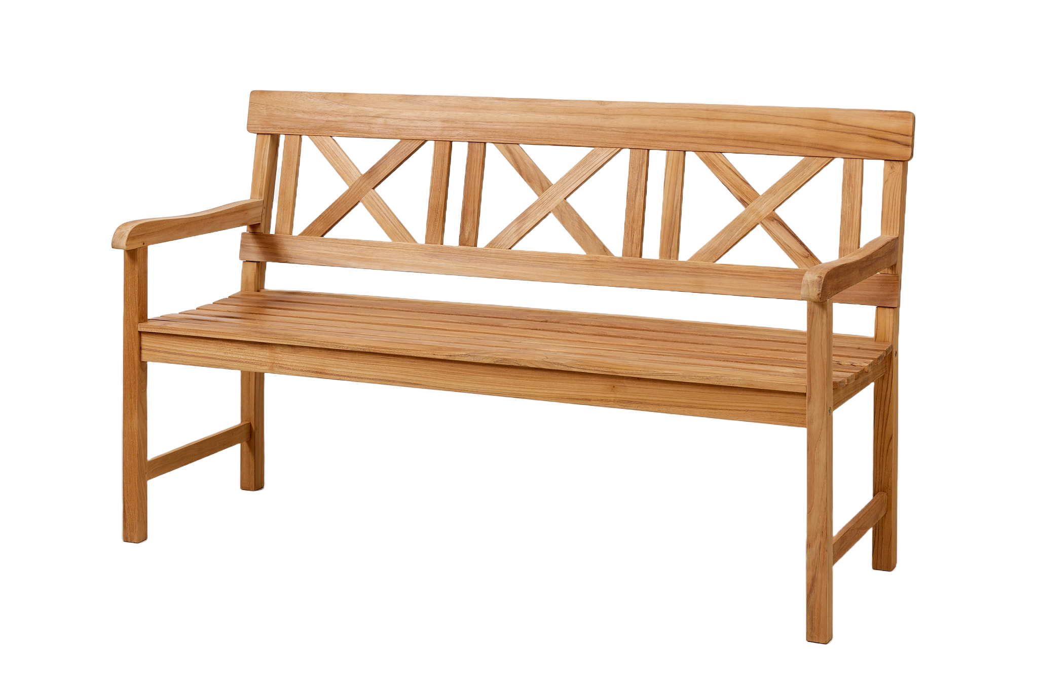 Sofiero-bänken finns i teak och vitmålad mahogny. Här visas den i teak.