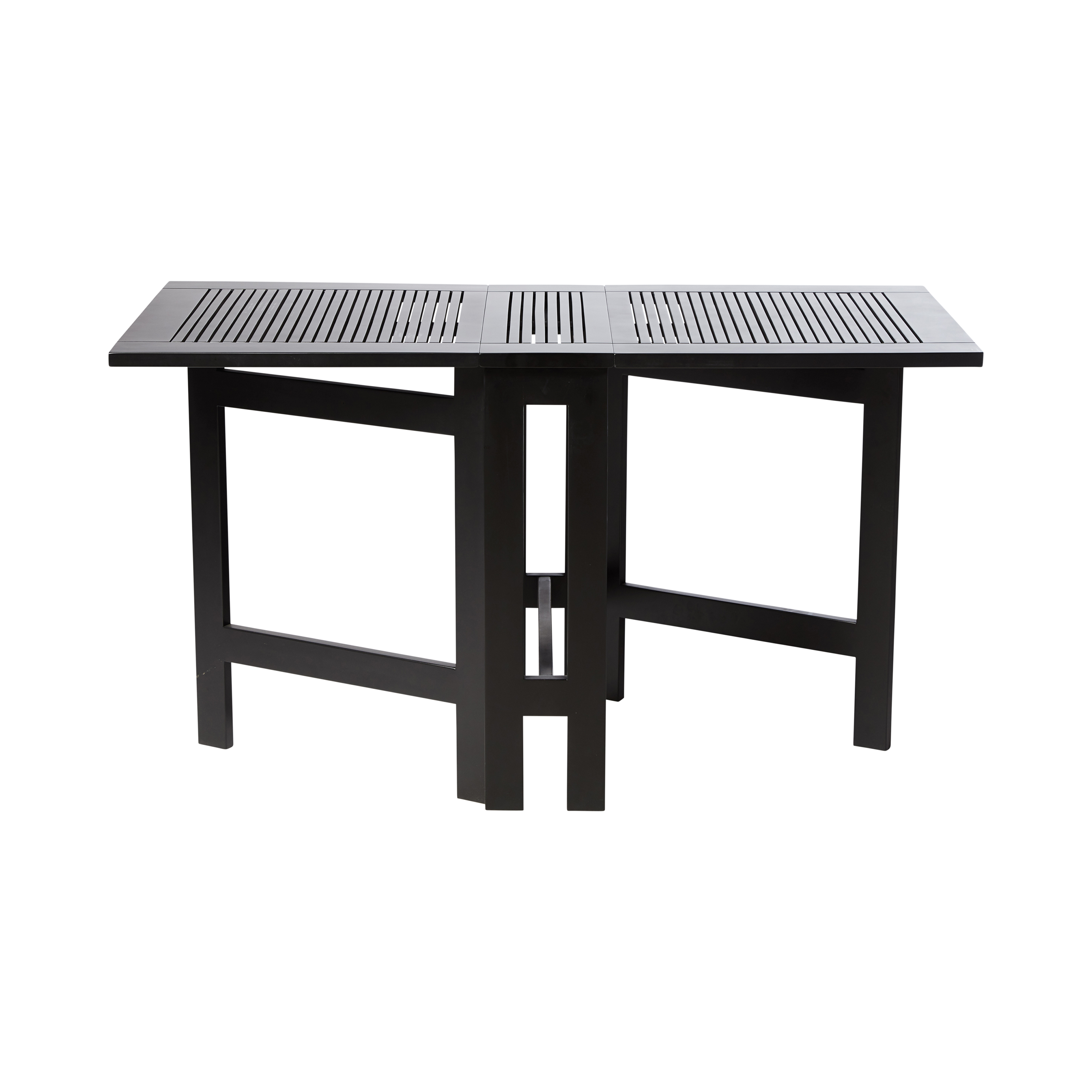 Ett elegant och flexibelt, rektangulärt fällbord i svartmålad mahogny — skapat för utemiljöer med varierande behov, där bordet kan ta lite plats, lite mer eller mycket.