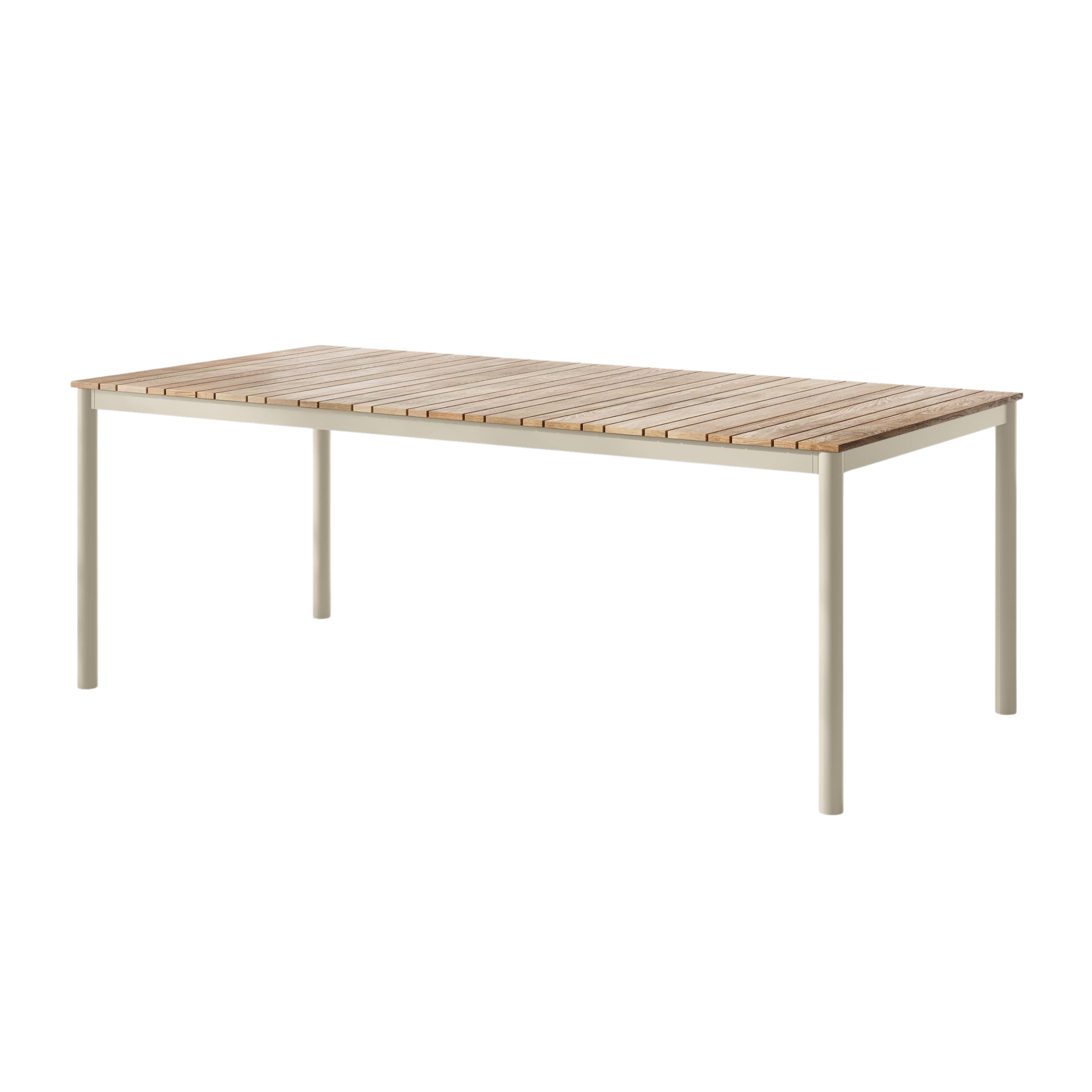 Det sandfärgade aluminiumstativet kombinerat med teaklameller i två olika bredder ger bordet en varm och tidlös karaktär, där det diskreta spelet i ytan tillför ett modernt och sofistikerat uttryck.