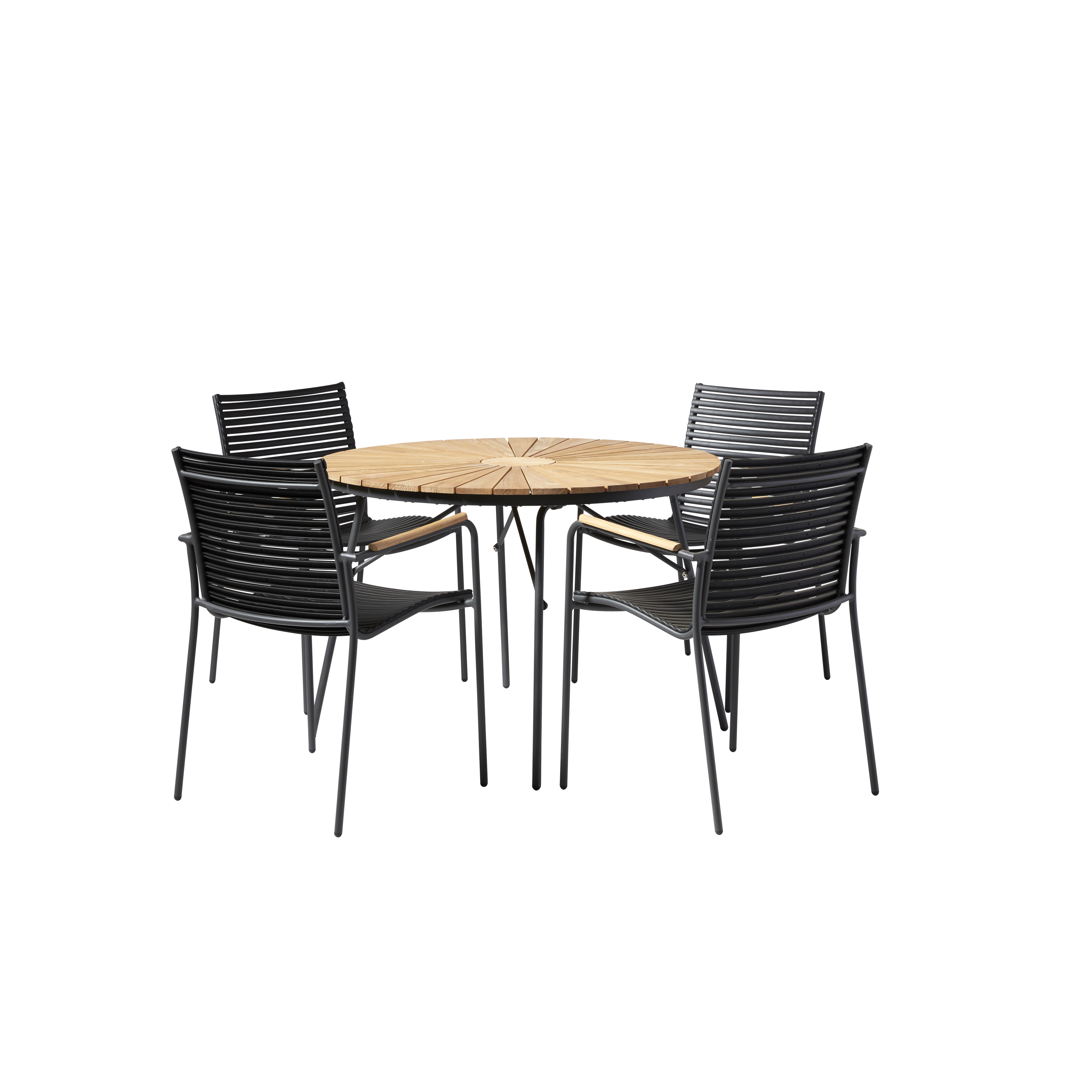 Ellen bordet med en diameter på 110 centimeter skapar tillsammans med fyra Mood Classic stolar ett harmoniskt och stilrent utomhusset där klassisk teak möter grafisk lätthet.