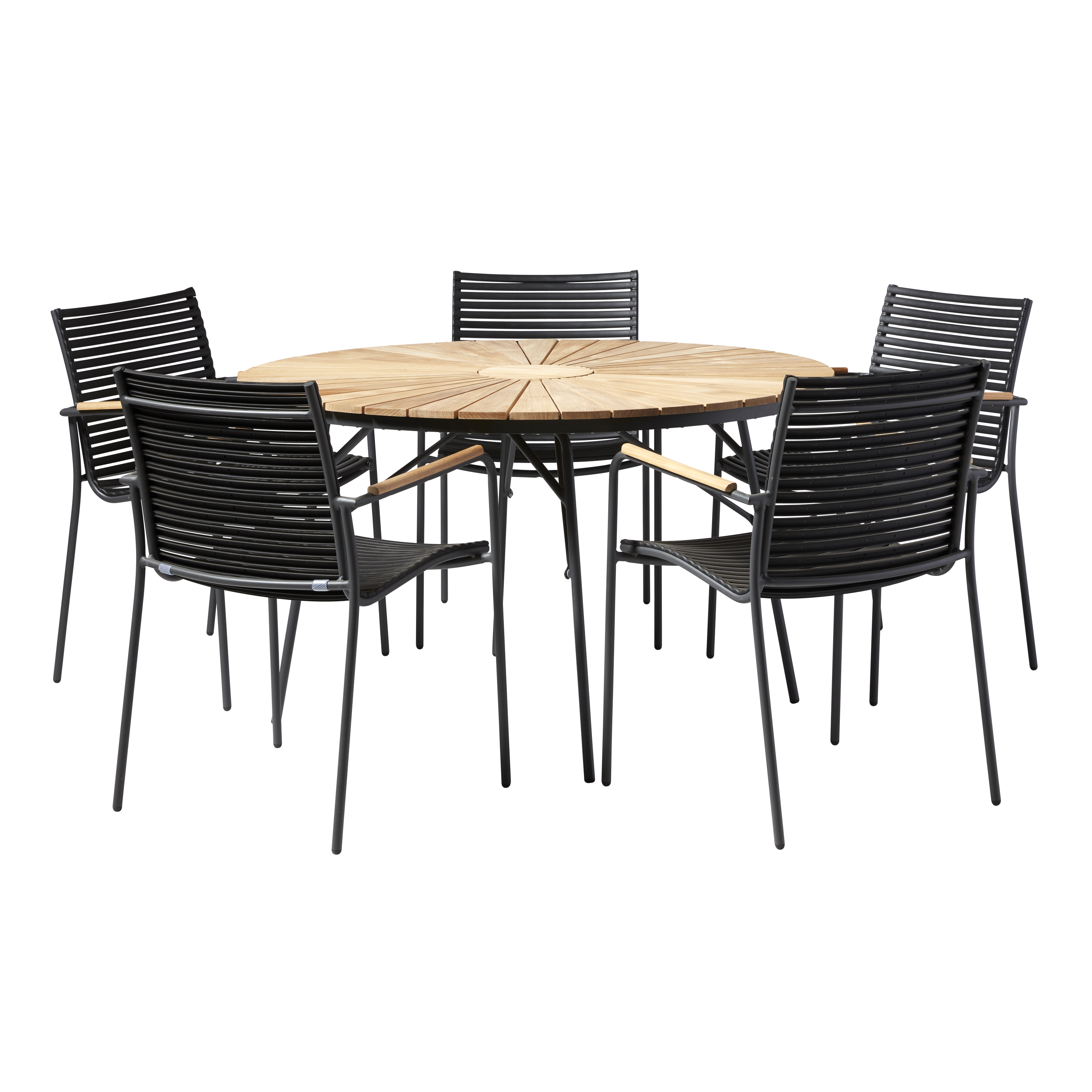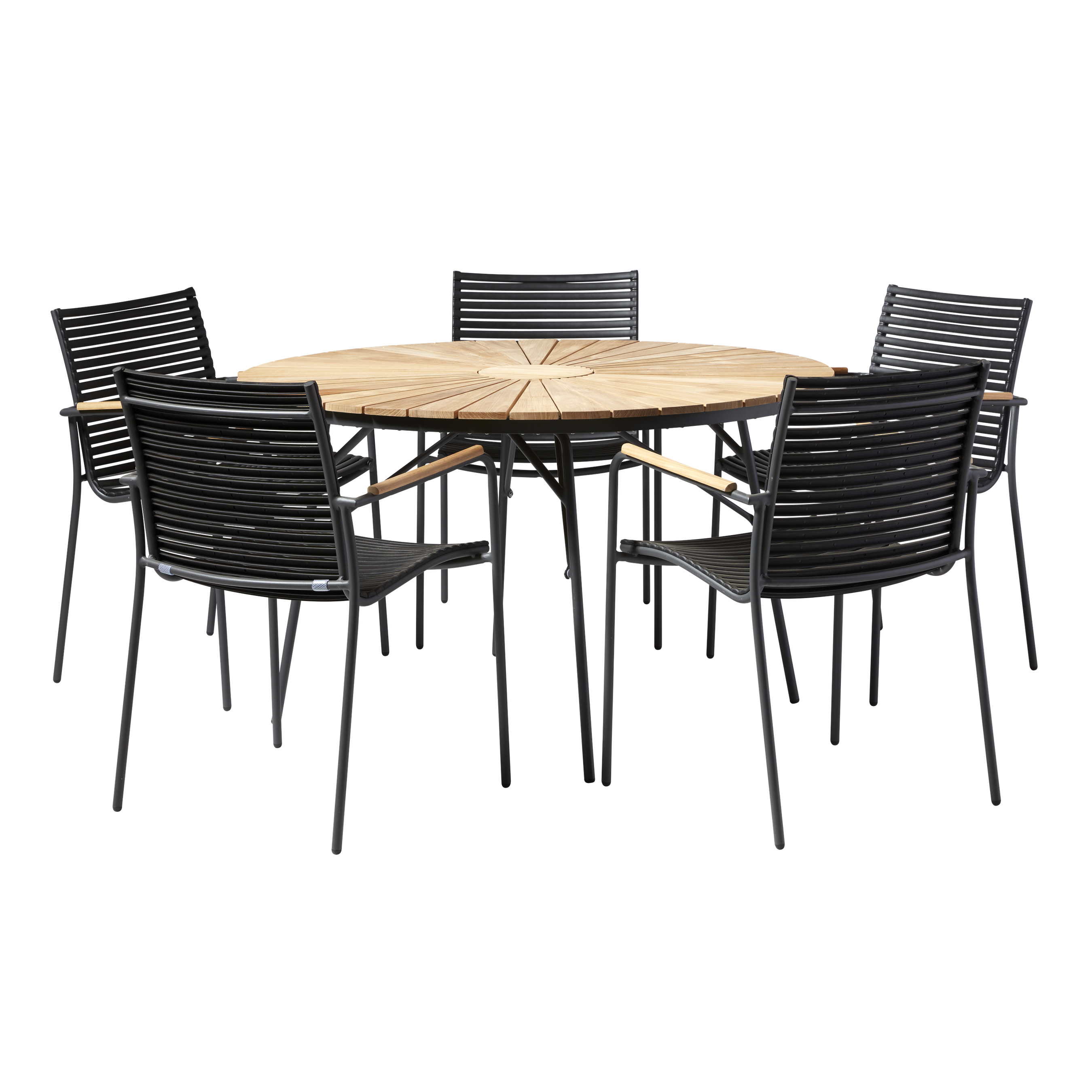 Teakbordets varma lameller står i fin kontrast till den antracitfärgade aluminiumramen, och stolarnas svarta lameller förstärker det grafiska uttrycket. Kombinationen av teak och aluminium skapar en modern och harmonisk helhet som passar naturligt på terrassen, i trädgården eller i sommarhuset.