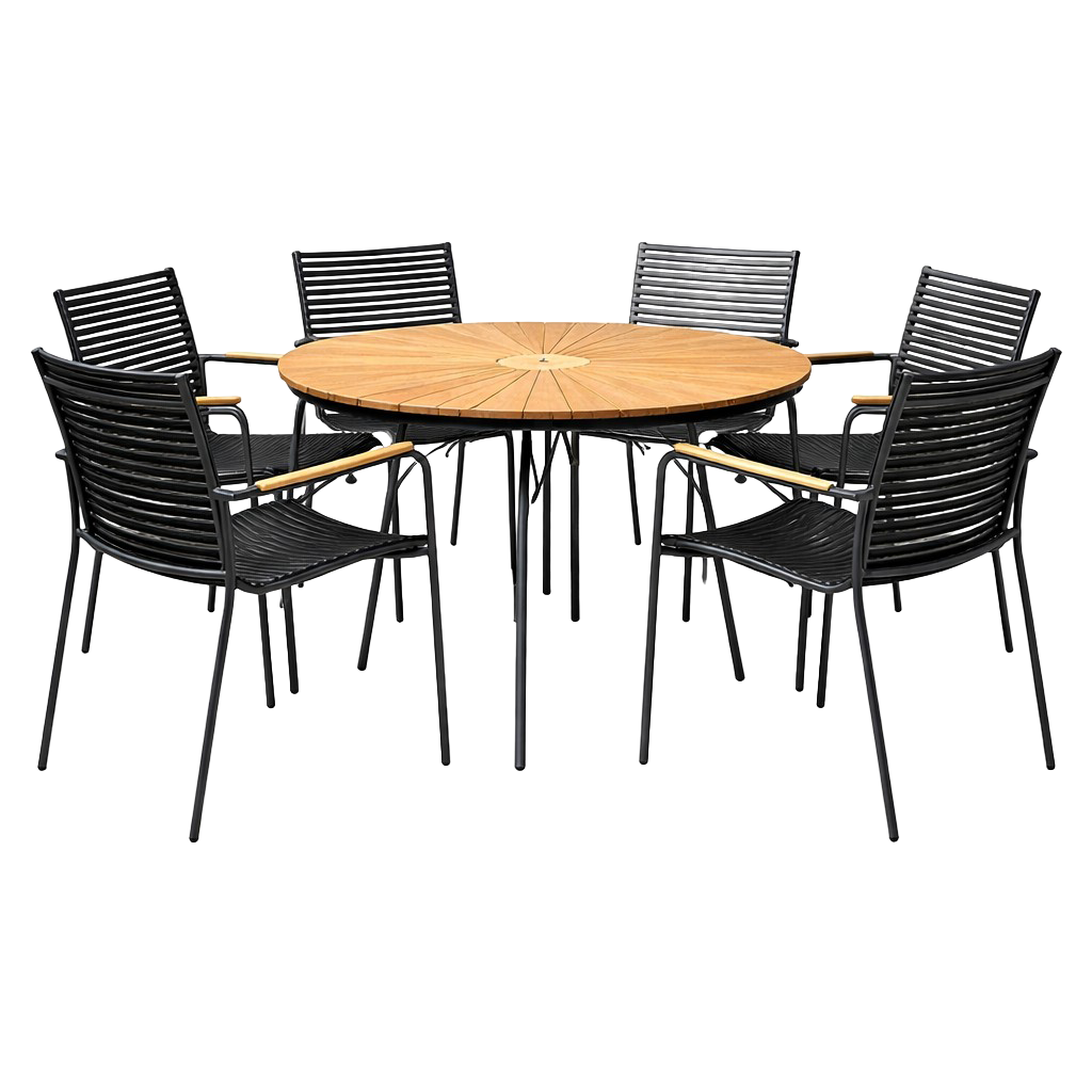 Ellen bordet med en diameter på 150 centimeter skapar tillsammans med sex Mood Classic stolar ett rymligt och harmoniskt utomhusset med gott om plats runt bordet.