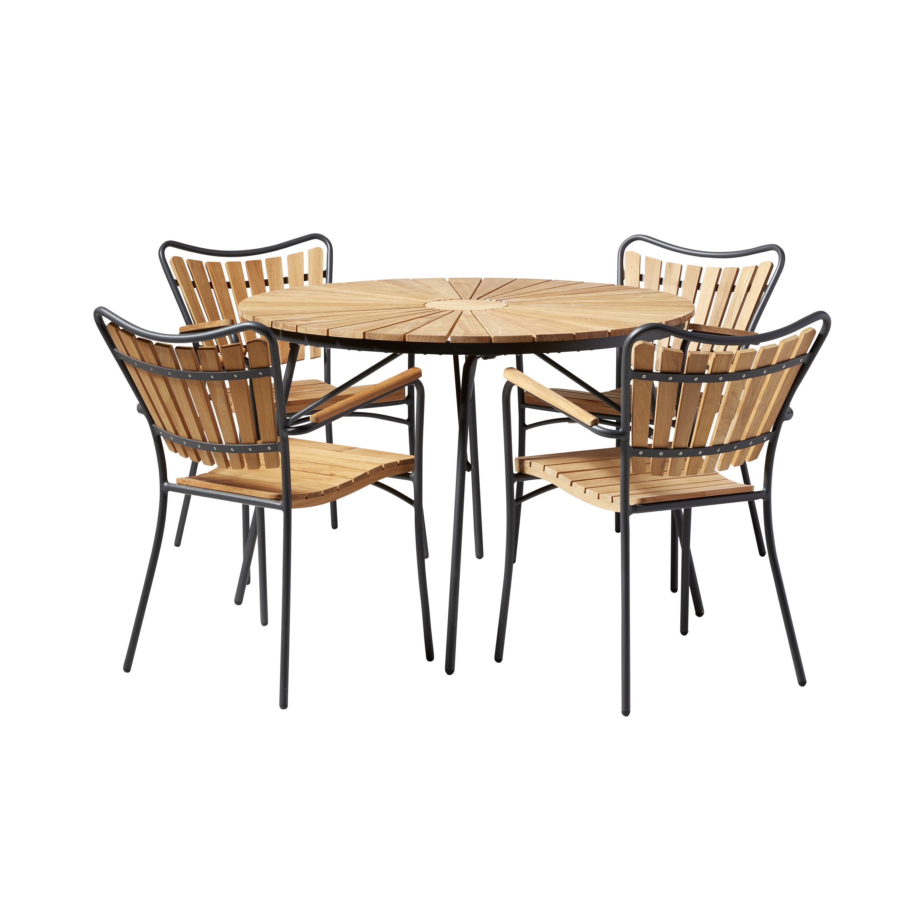 Ett komplett Ellen-set med runt bord med en diameter på 110 centimeter och fyra stolar i teak och antracitfärgat stativ – skapat för uteliv, närvaro och långa samtal runt bordet.