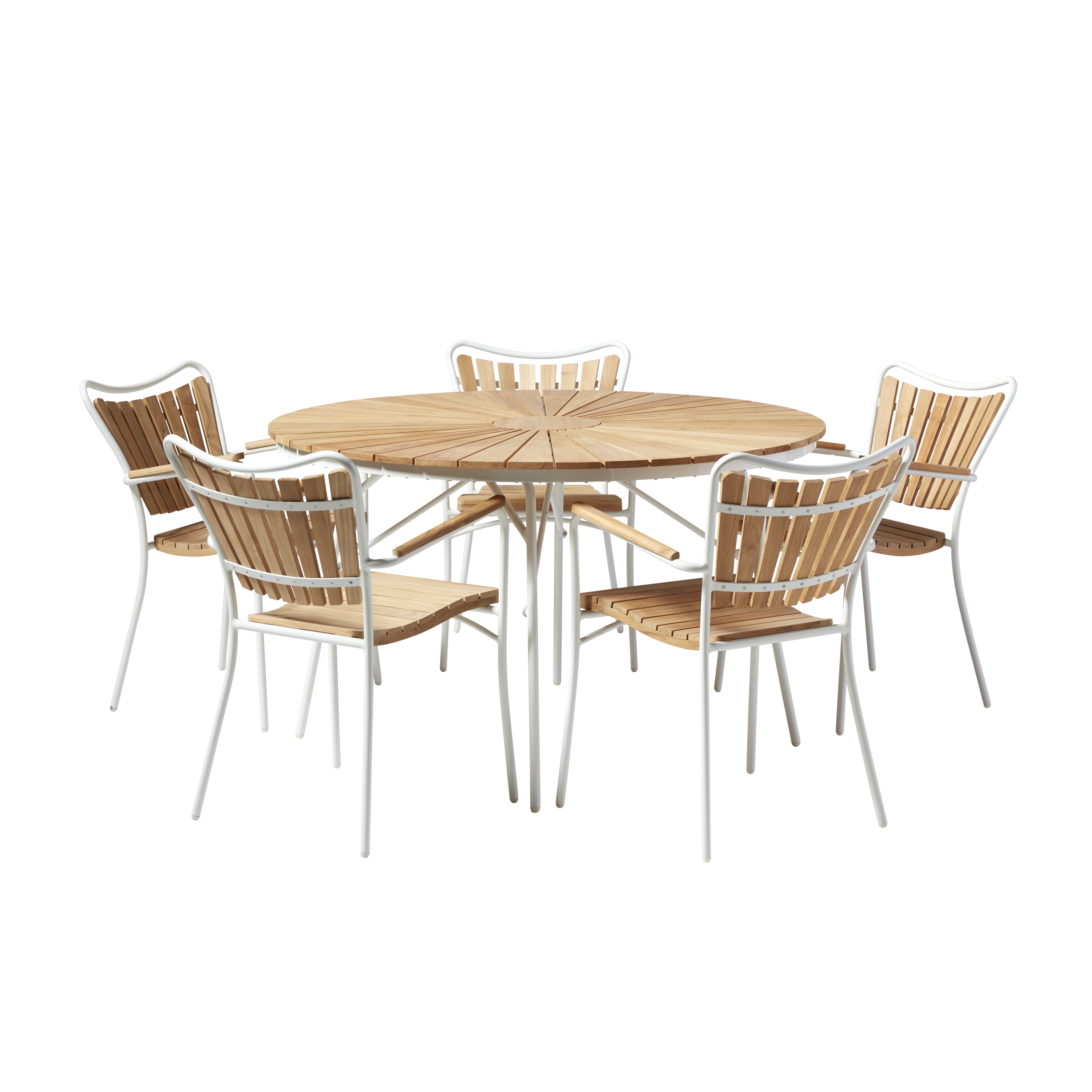 Ett klassiskt och nostalgiskt Ellen-set med runt bord med en diameter på 130 centimeter och fem stolar – inspirerat av tidlöst skandinaviskt uteliv och långa sommardagar i gott sällskap.