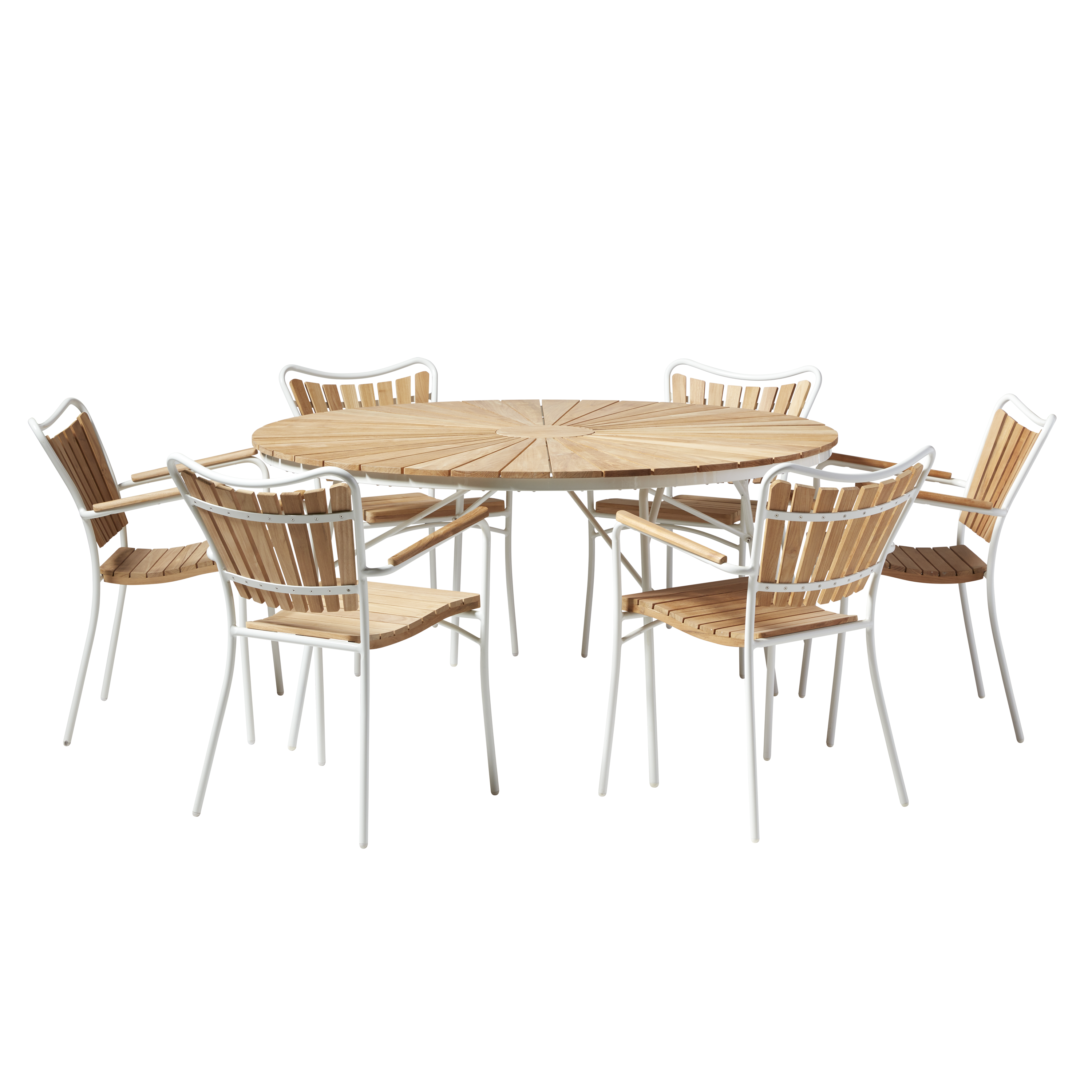 Ett generöst Ellen-set med runt bord med en diameter på 150 centimeter och sex stolar i teak och vitt stativ – skapat för stora utemiljöer, långa sommarkvällar och gott om plats för både vardag och gäster.