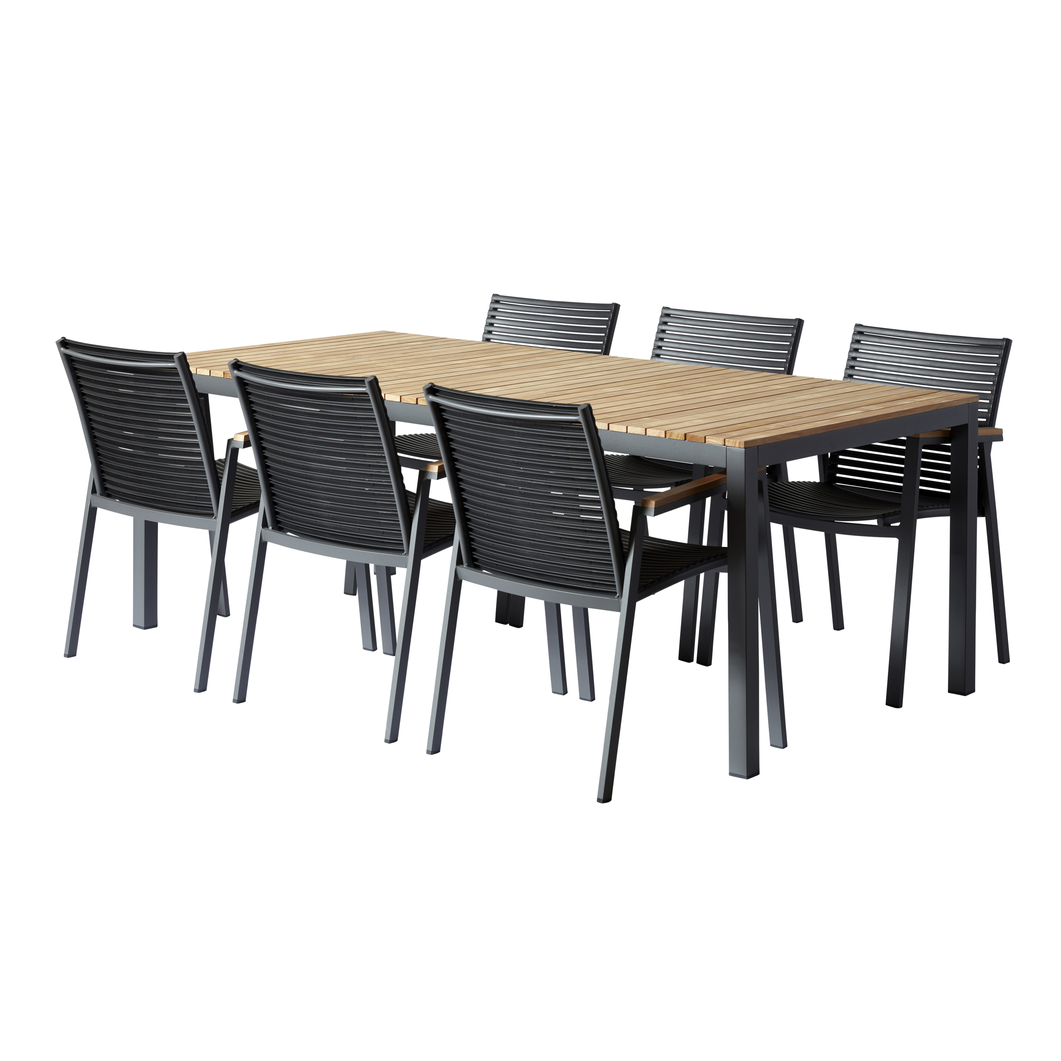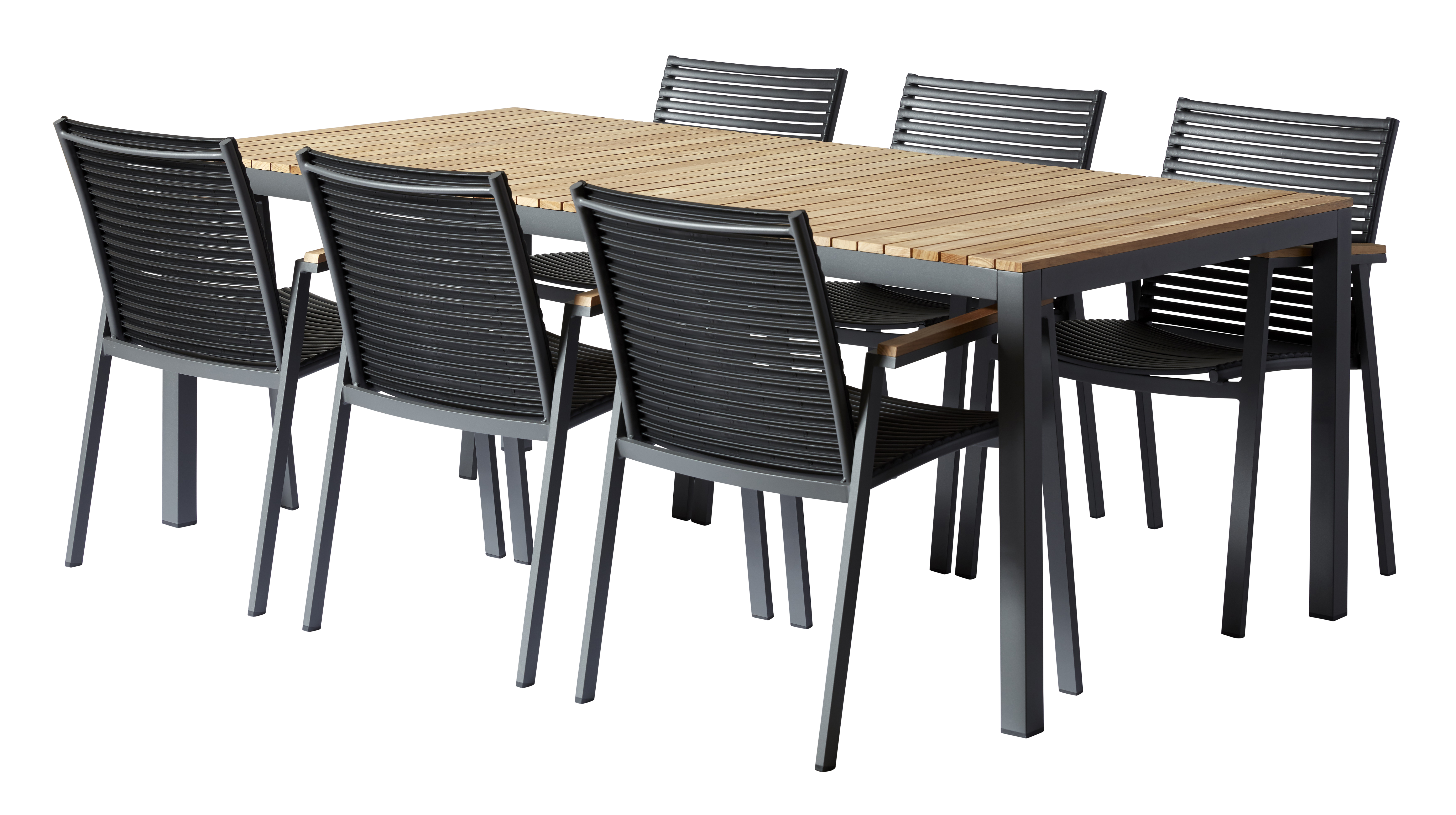 Den antracitgrå aluminiumstommen skapar en skarp och modern ram, medan teaklamellerna på bordsskivan och armstöden tillför värme, djup och naturlig kontrast. Här möts det stringenta och det sinnliga i en välbalanserad helhet.