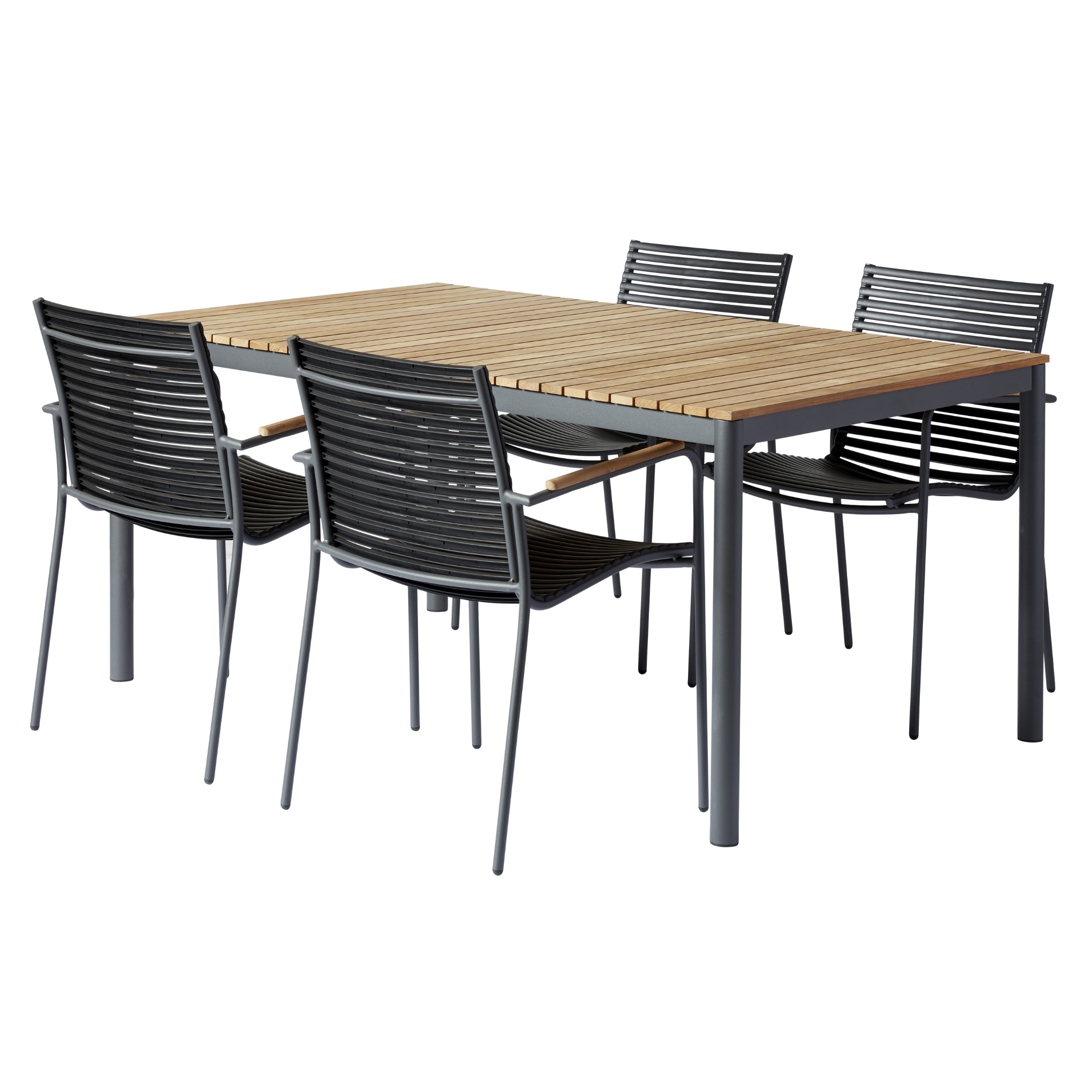 Mood Classic setet är ett stilrent och harmoniskt trädgårdsset som passar naturligt in i moderna trädgårdar och uterum. Här möter klassiskt formspråk moderna material i en balanserad helhet.Det solida teakbordet tillsammans med fyra Mood Classic stolar skapar en lugn och genomtänkt ram för utelivet. Kombinationen av varma teaklameller och antracitfärgat aluminium ger ett uttryck som känns både tidlöst och modernt.Bordets generösa storlek ger plats för vardagens måltider och långa kvällar runt bordet, medan stolarna tillför komfort och karaktär med sin markanta lamelldesign och teakdetaljer på armstöden.Materialvalet gör konstruktionen robust och väderbeständig. Den pulverlackerade aluminiumramen säkerställer stabilitet och ett lätt visuellt uttryck, medan teaken tillför värme och naturlig struktur.Skapat för terrassen och trädgården – ett samlat uttryck där funktion, design och material går samman i en helhet.