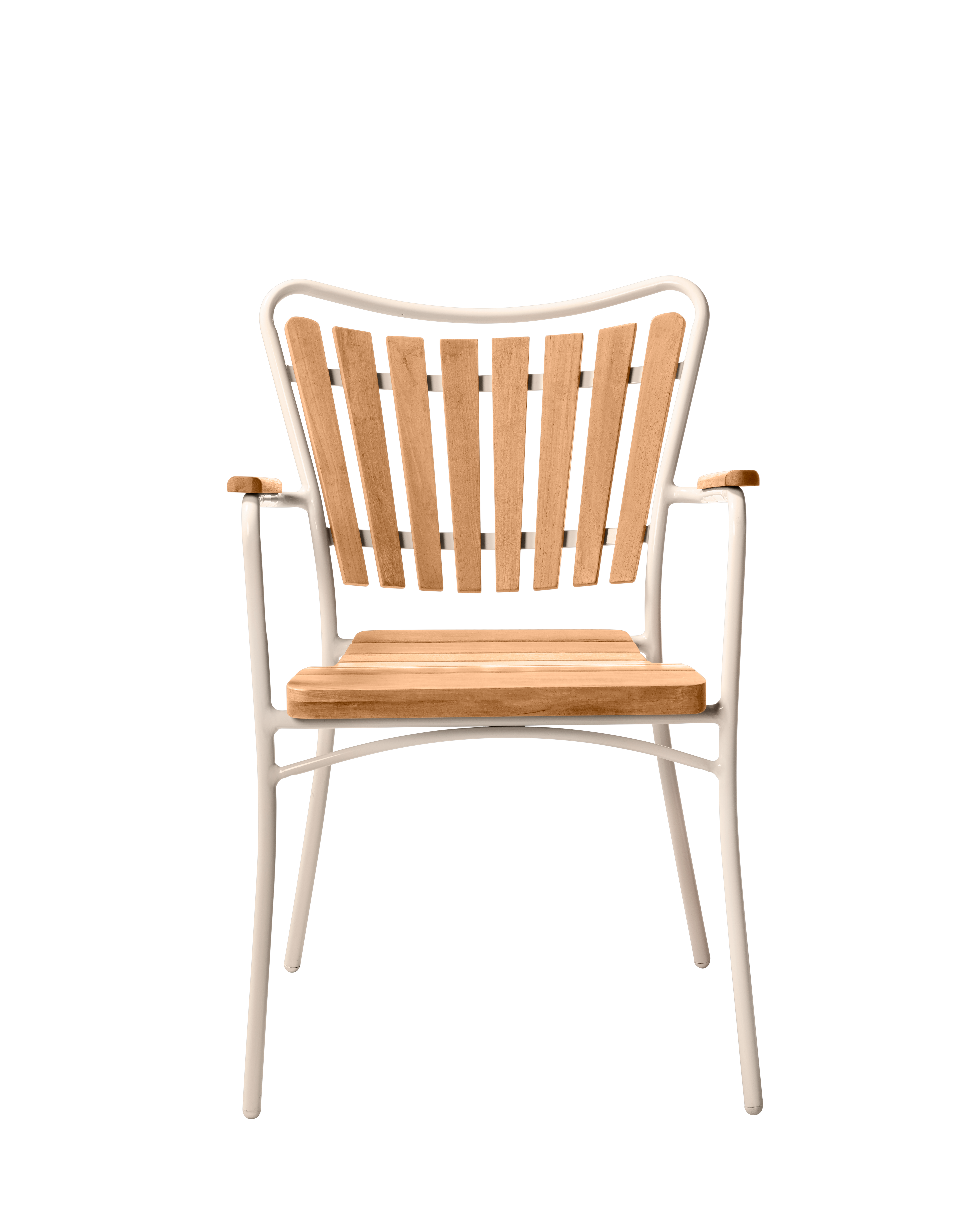 Tillverkad i varma teaklameller och pulverlackerad aluminium – en hållbar och stilren kombination. När den inte används kan stolen enkelt staplas.
