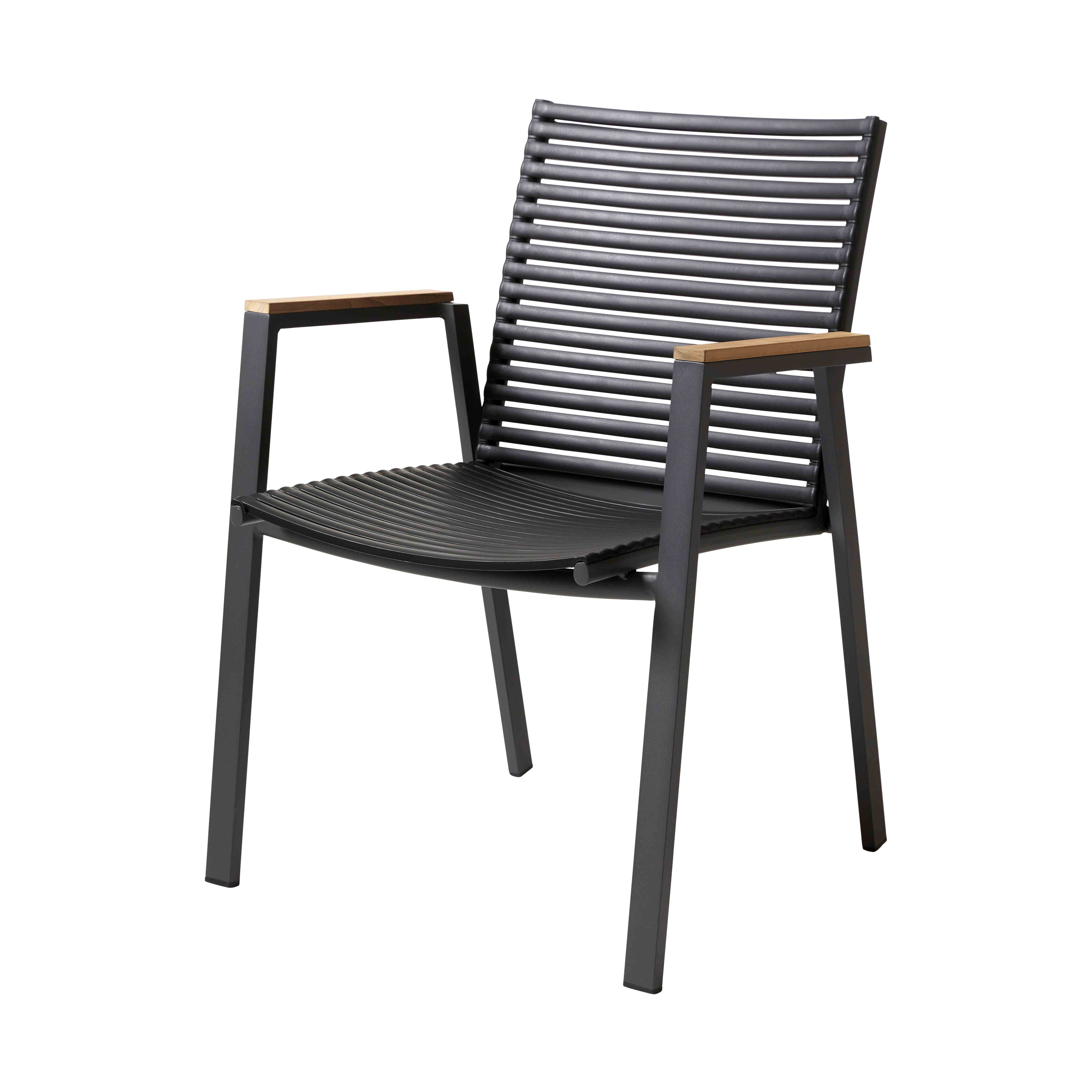 En modern och karaktärsstark stol i antracitgrå aluminium, teak och smala, väderbeständiga lameller – skapad för utemiljöer där lätthet och grafisk harmoni går hand i hand.
