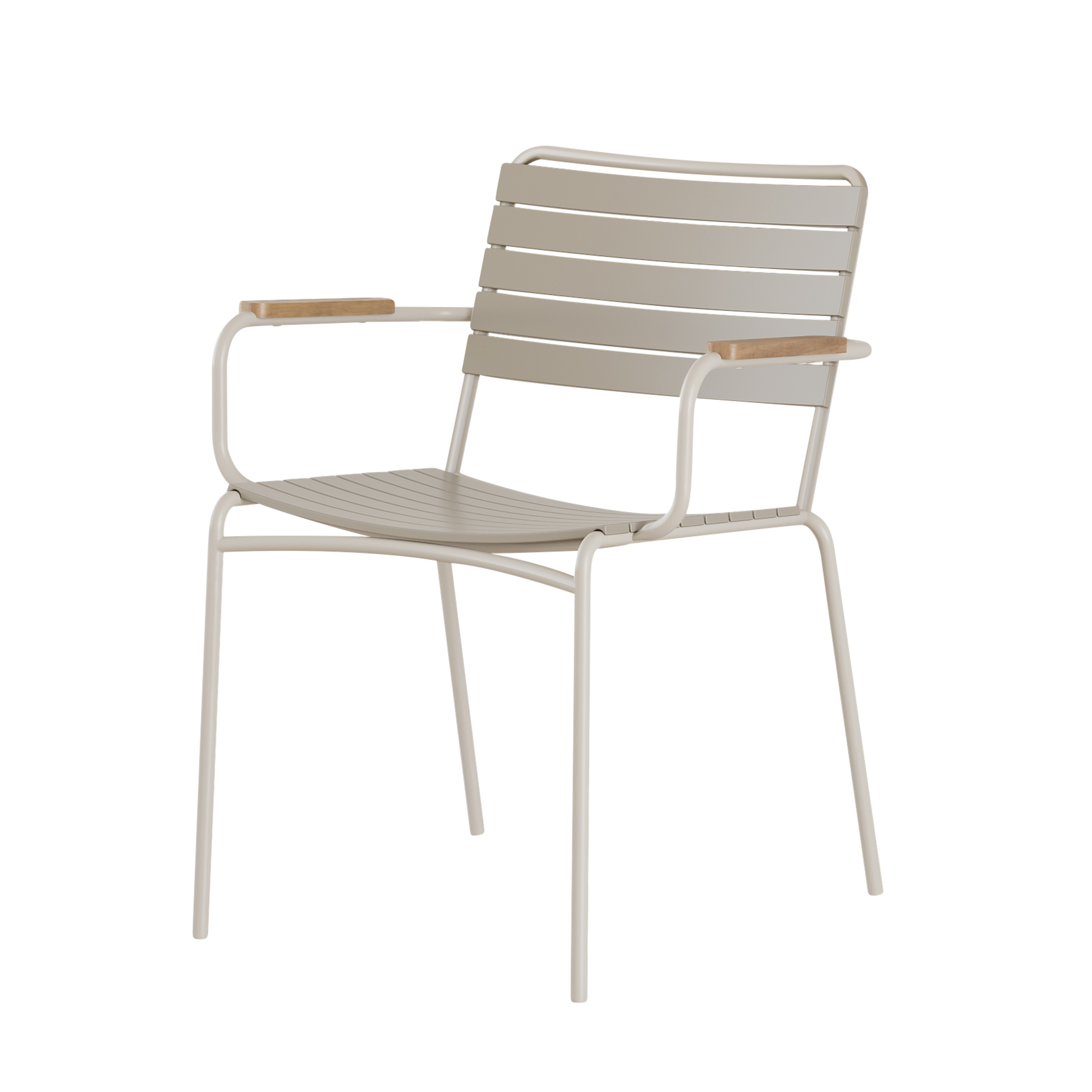 Den sandfärgade aluminiumramen, kombinerad med armstöd i teak och sandfärgade lameller i väderbeständig PP, ger stolen ett lugnt, ljust, nordiskt och modernt uttryck.